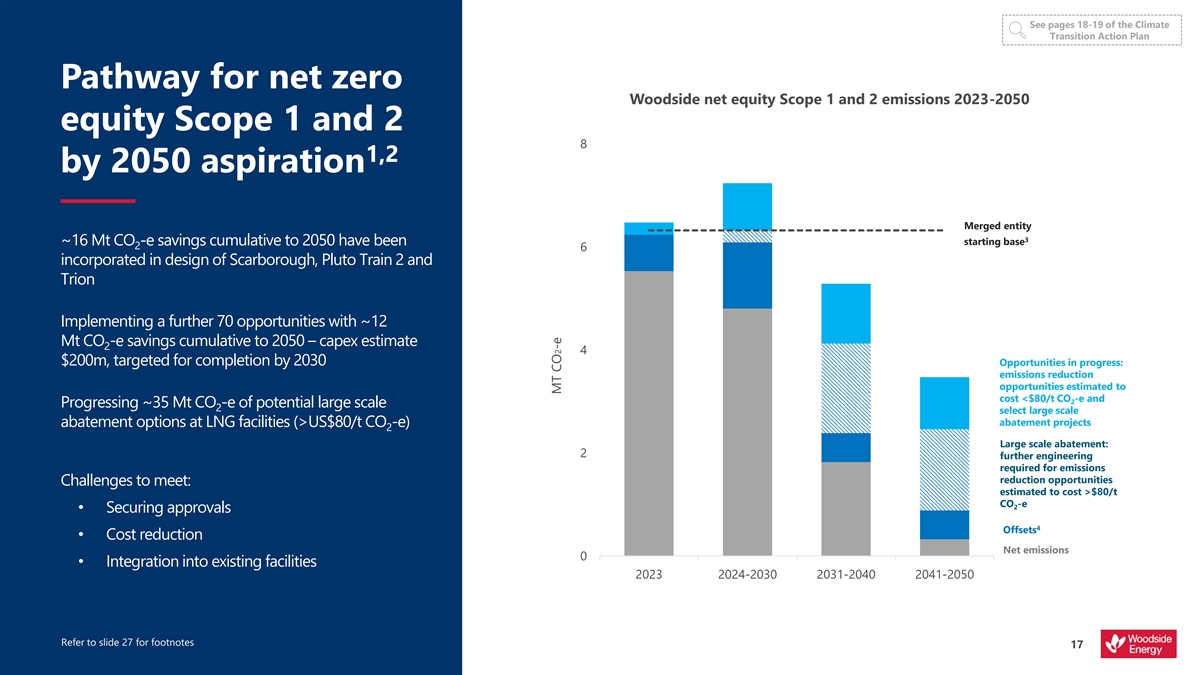 See pages 18-19 of the Climate Transition Action Plan Pathway for net zero Woodside net equity Scope 1 and 2 emissions 2023-2050 equity Scope 1 and 2 8 1,2 by 2050 aspiration Merged entity 3 starting base ~16 Mt CO -e savings cumulative to 2050 have been 2 6 incorporated in design of Scarborough, Pluto Train 2 and Trion Implementing a further 70 opportunities with ~12 Mt CO -e savings cumulative to 2050 – capex estimate 2 4 $200m, targeted for completion by 2030 Opportunities in progress: emissions reduction opportunities estimated to cost <$80/t CO -e and 2 Progressing ~35 Mt CO -e of potential large scale 2 select large scale abatement projects abatement options at LNG facilities (>US$80/t CO -e) 2 Large scale abatement: 2 further engineering required for emissions reduction opportunities Challenges to meet: estimated to cost >$80/t CO -e 2 • Securing approvals 4 Offsets • Cost reduction Net emissions 0 • Integration into existing facilities 2023 2024-2030 2031-2040 2041-2050 Refer to slide 27 for footnotes 17 MT CO2-e