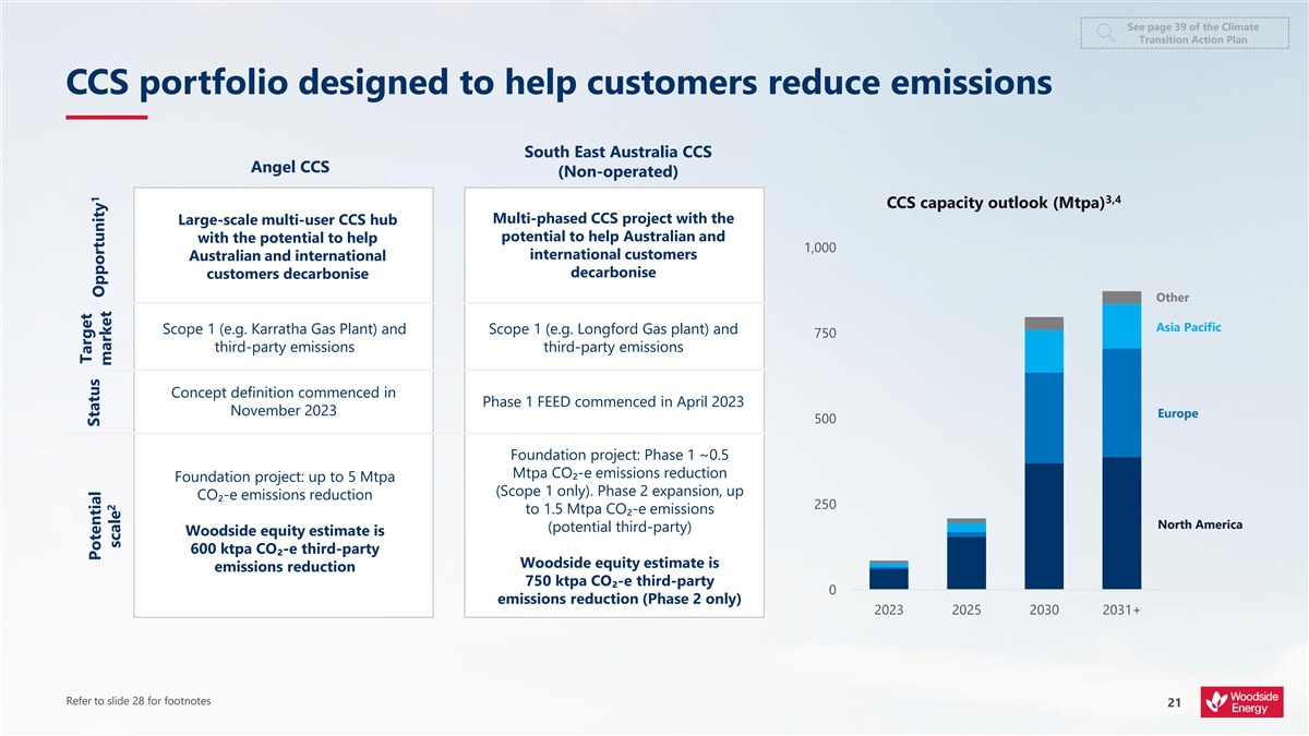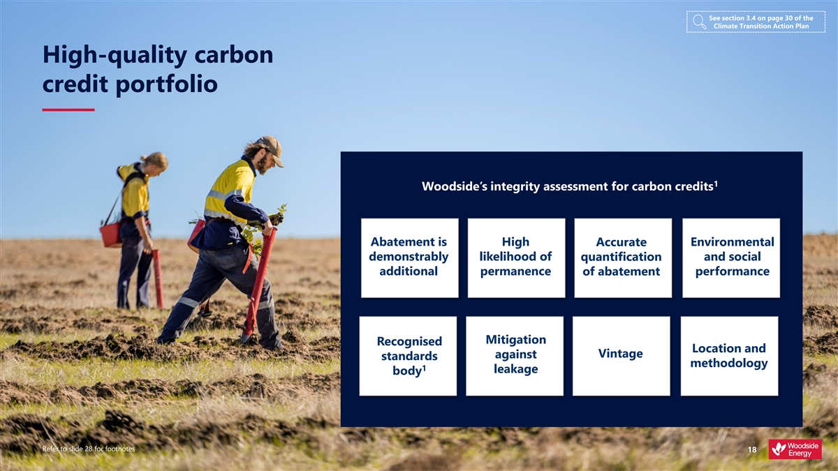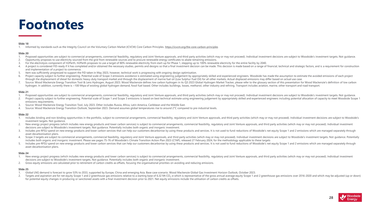 Footnotes Slide 18 1. Informed by standards such as the Integrity Council on the Voluntary Carbon Market (ICVCM) Core Carbon Principles. https://icvcm.org/the-core-carbon-principles Slide 20 1. Proposed opportunities are subject to commercial arrangements, commercial feasibility, regulatory and Joint Venture approvals, and third party activities (which may or may not proceed). Individual investment decisions are subject to Woodside’s investment targets. Not guidance. 2. Opportunity proposes to use electricity sourced from the grid from renewable sources and to procure renewable energy certificates to abate remaining emissions. 3. For the electrolysis component of H2Perth, H2Perth proposes to use a target of 80% renewable electricity from start-up for Phase 1, stepping up to 100% renewable electricity for the entire facility by 2040. 4. A project is considered FID-ready if it has completed and/or obtained the necessary studies, permits and designs so that a final investment decision can be made. This decision is made based on a range of financial, technical and strategic factors, and is a requirement for construction and implementation of a project to commence. 5. Item was sufficiently progressed to support the FID taken in May 2023, however, technical work is progressing with ongoing design optimisation. 6. Project capacity subject to further engineering. Potential scale of Scope 3 emissions avoidance is estimated using engineering judgement by appropriately skilled and experienced engineers. Woodside has made the assumption to estimate the avoided emissions of each project through the displacement of diesel for domestic heavy-duty transport market and through the displacement of marine fuel oil (Low Sulphur Fuel Oil) for all other markets. Actual displaced emissions may differ based on actual use case. 7. Source: Wood Mackenzie Energy Transition Tool & Lens Hydrogen, August 2023. Wood Mackenzie defines low carbon hydrogen in its Q3 2023 Global Hydrogen Market Tracker, please refer to the glossary section of this presentation for Wood Mackenzie’s definition of low carbon hydrogen. In addition, currently there is ~100 Mtpa of existing global hydrogen demand, fossil fuel based. Other includes buildings, losses, methanol, other industry and refining. Transport includes aviation, marine, other transport and road transport. Slide 21 1. Proposed opportunities are subject to commercial arrangements, commercial feasibility, regulatory and Joint Venture approvals, and third party activities (which may or may not proceed). Individual investment decisions are subject to Woodside’s investment targets. Not guidance. 2. Project capacity subject to further engineering. Potential scale of Scope 1 and Scope 3 emissions is based on best technical estimate using engineering judgement by appropriately skilled and experienced engineers including potential allocation of capacity to meet Woodside Scope 1 emissions requirements. 3. Source: Wood Mackenzie Energy Transition Tool, July 2023. Other includes Russia, Africa, Latin America, Caribbean and the Middle East. 4. Source: Wood Mackenzie Energy Transition Outlook, September 2023. Demand assumes global temperatures rise to around 2°C compared to pre-industrial levels. Slide 22 1. Includes binding and non-binding opportunities in the portfolio, subject to commercial arrangements, commercial feasibility, regulatory and Joint Venture approvals, and third party activities (which may or may not proceed). Individual investment decisions are subject to Woodside’s investment targets. Not guidance. 2. New energy project progress (which includes new energy products and lower carbon services) is subject to commercial arrangements, commercial feasibility, regulatory and Joint Venture approvals, and third party activities (which may or may not proceed). Individual investment decisions are subject to Woodside’s investment targets. Not guidance. Potentially includes both organic and inorganic investment. 3. Includes pre-RFSU spend on new energy products and lower carbon services that can help our customers decarbonise by using these products and services. It is not used to fund reductions of Woodside’s net equity Scope 1 and 2 emissions which are managed separately through asset decarbonisation plans. 4. Scope 3 targets are subject to commercial arrangements, commercial feasibility, regulatory and Joint Venture approvals, and third party activities (which may or may not proceed). Individual investment decisions are subject to Woodside’s investment targets. Not guidance. Potentially includes both organic and inorganic investment. Please see pages 75-76 of Woodside’s Climate Transition Action Plan 2023 (CTAP), released 27 February 2024, for the methodology applicable to these targets 5. Includes pre-RFSU spend on new energy products and lower carbon services that can help our customers decarbonise by using these products and services. It is not used to fund reductions of Woodside’s net equity Scope 1 and 2 emissions which are managed separately through asset decarbonisation plans. Slide 24 1. New energy project progress (which includes new energy products and lower carbon services) is subject to commercial arrangements, commercial feasibility, regulatory and Joint Venture approvals, and third party activities (which may or may not proceed). Individual investment decisions are subject to Woodside’s investment targets. Not guidance. Potentially includes both organic and inorganic investment. 2. Gross equity emissions are calculated prior to retirement of carbon credits as offsets, focusing the organisational priorities on avoiding and reducing emissions. Slide 25 1. Global LNG demand is forecast to grow 53% to 2033, supported by Europe, China and emerging Asia. Base case scenario. Wood Mackenzie Global Gas Investment Horizon Outlook, October 2023. 2. Targets and aspiration are for net equity Scope 1 and 2 greenhouse gas emissions relative to a starting base 