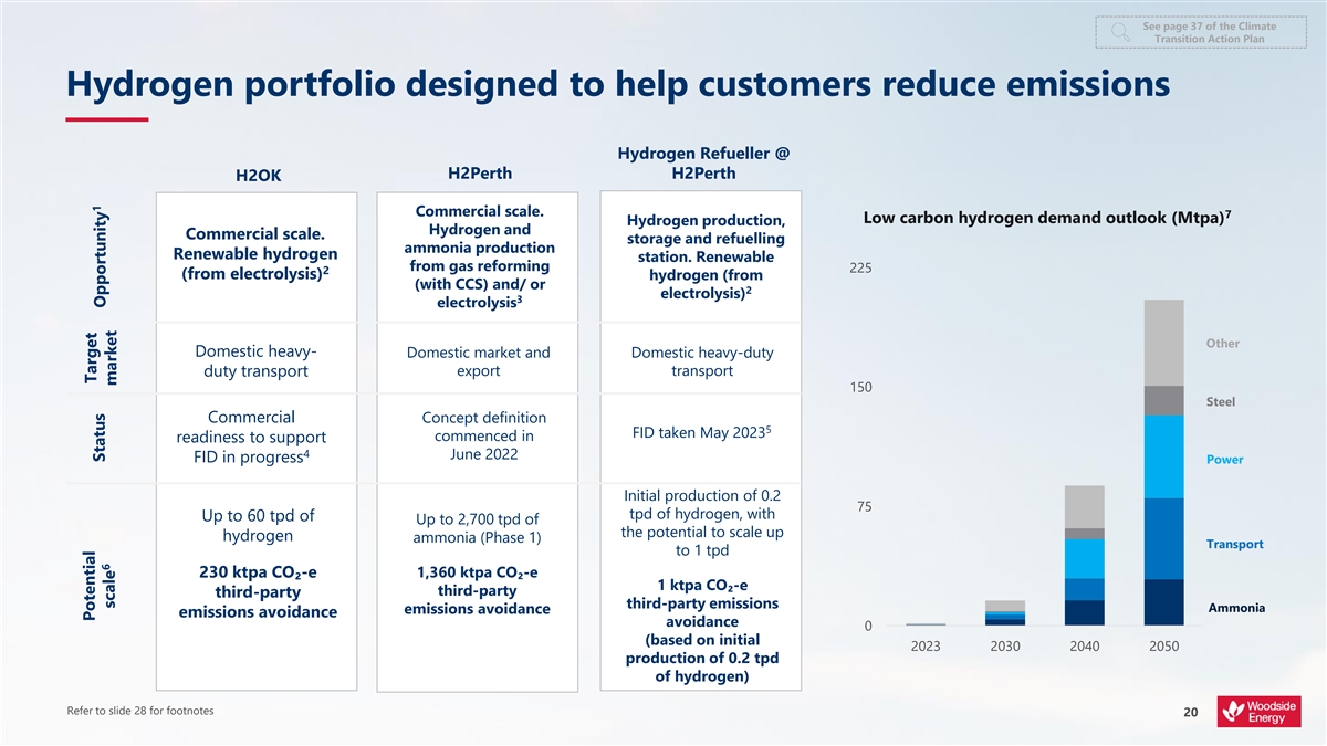 See page 37 of the Climate Transition Action Plan Hydrogen portfolio designed to help customers reduce emissions Hydrogen Refueller @ H2Perth H2Perth H2OK Commercial scale. 7 Low carbon hydrogen demand outlook (Mtpa) Hydrogen production, Hydrogen and Commercial scale. storage and refuelling ammonia production Renewable hydrogen station. Renewable from gas reforming 225 2 (from electrolysis) hydrogen (from (with CCS) and/ or 2 electrolysis) 3 electrolysis Other Domestic heavy- Domestic market and Domestic heavy-duty export transport duty transport v 150 Steel Commercial Concept definition 5 FID taken May 2023 commenced in readiness to support 4 June 2022 FID in progress Power Initial production of 0.2 75 tpd of hydrogen, with Up to 60 tpd of Up to 2,700 tpd of the potential to scale up hydrogen ammonia (Phase 1) Transport to 1 tpd 230 ktpa CO₂-e 1,360 ktpa CO₂-e 1 ktpa CO₂-e third-party third-party third-party emissions Ammonia emissions avoidance emissions avoidance avoidance 0 (based on initial 2023 2030 2040 2050 production of 0.2 tpd of hydrogen) Refer to slide 28 for footnotes 20 Potential Target 1 Status Opportunity 6 scale market