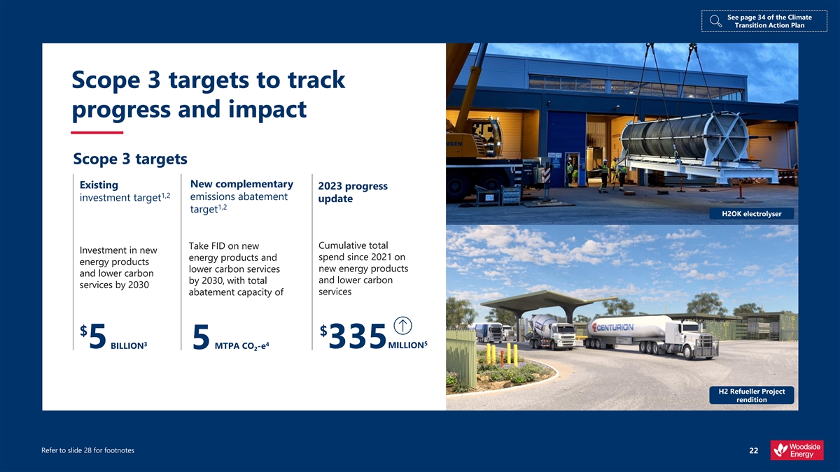 See page 34 of the Climate Transition Action Plan Scope 3 targets to track progress and impact Scope 3 targets New complementary Existing 2023 progress 1,2 emissions abatement investment target update 1,2 target H2OK electrolyser Take FID on new Cumulative total Investment in new energy products and spend since 2021 on energy products new energy products lower carbon services and lower carbon and lower carbon by 2030, with total services by 2030 services abatement capacity of $ $ 3 4 5 5 BILLION MTPA CO -e 335MILLION 5 2 H2 Refueller Project rendition Refer to slide 28 for footnotes 22