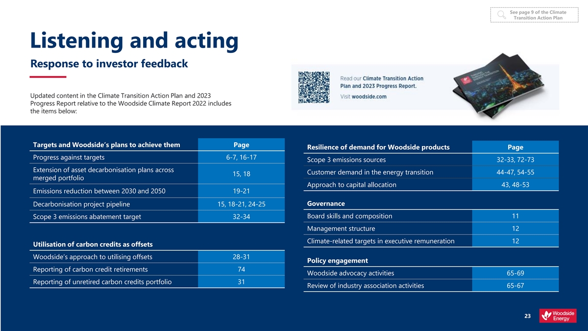 See page 9 of the Climate Transition Action Plan Listening and acting Response to investor feedback Updated content in the Climate Transition Action Plan and 2023 Progress Report relative to the Woodside Climate Report 2022 includes the items below: Targets and Woodside’s plans to achieve them Page Resilience of demand for Woodside products Page Progress against targets 6-7, 16-17 Scope 3 emissions sources 32-33, 72-73 Extension of asset decarbonisation plans across Customer demand in the energy transition 44-47, 54-55 15, 18 merged portfolio Approach to capital allocation 43, 48-53 Emissions reduction between 2030 and 2050 19-21 Governance Decarbonisation project pipeline 15, 18-21, 24-25 Board skills and composition 11 Scope 3 emissions abatement target 32-34 Management structure 12 Climate-related targets in executive remuneration 12 Utilisation of carbon credits as offsets Woodside’s approach to utilising offsets 28-31 Policy engagement Reporting of carbon credit retirements 74 Woodside advocacy activities 65-69 Reporting of unretired carbon credits portfolio 31 Review of industry association activities 65-67 23 23