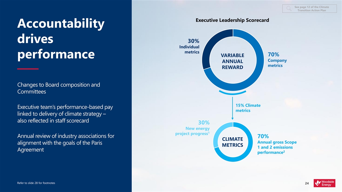 See page 12 of the Climate Transition Action Plan Executive Leadership Scorecard Accountability drives 30% Individual metrics 70% VARIABLE performance Company ANNUAL metrics REWARD Changes to Board composition and Committees 15% Climate Executive team’s performance-based pay metrics linked to delivery of climate strategy – also reflected in staff scorecard 30% New energy 1 project progress Annual review of industry associations for 70% CLIMATE Annual gross Scope alignment with the goals of the Paris METRICS 1 and 2 emissions Agreement 2 performance Refer to slide 28 for footnotes 24
