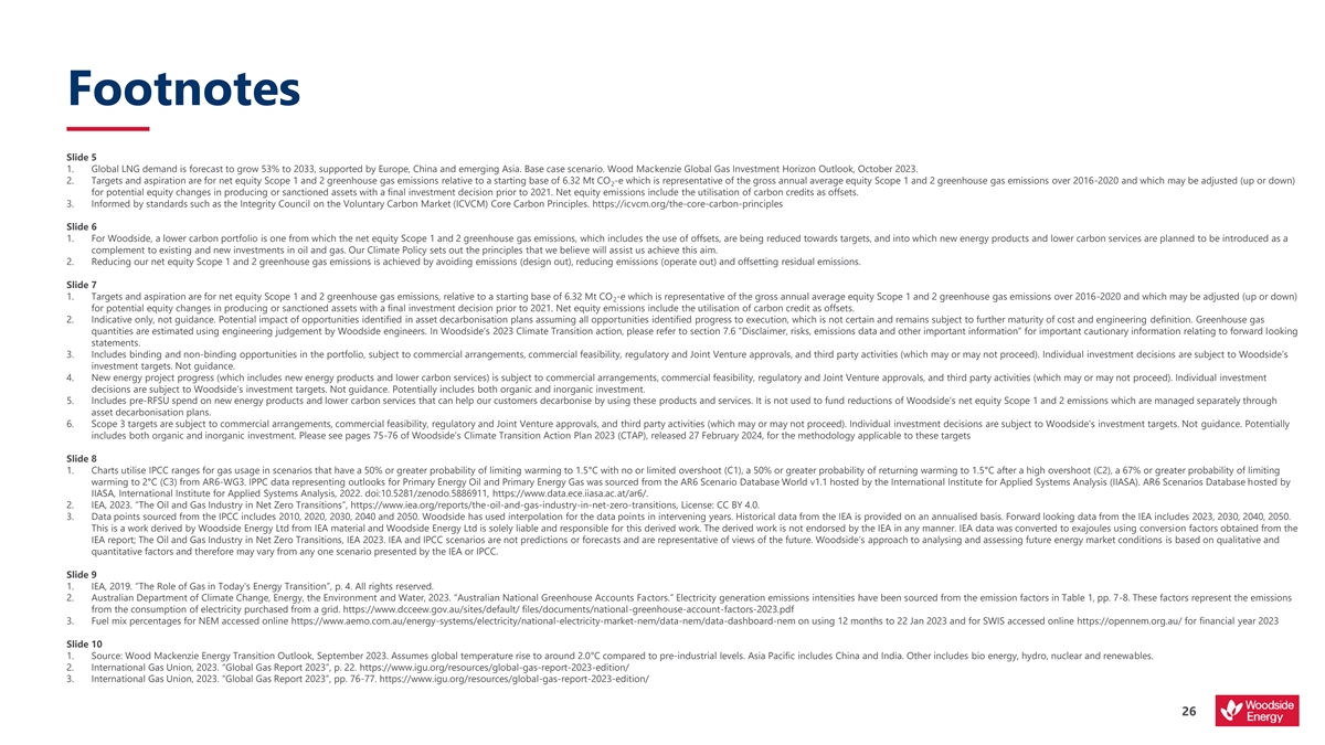 Footnotes Slide 5 1. Global LNG demand is forecast to grow 53% to 2033, supported by Europe, China and emerging Asia. Base case scenario. Wood Mackenzie Global Gas Investment Horizon Outlook, October 2023. 2. Targets and aspiration are for net equity Scope 1 and 2 greenhouse gas emissions relative to a starting base of 6.32 Mt CO -e which is representative of the gross annual average equity Scope 1 and 2 greenhouse gas emissions over 2016-2020 and which may be adjusted (up or down) 2 for potential equity changes in producing or sanctioned assets with a final investment decision prior to 2021. Net equity emissions include the utilisation of carbon credits as offsets. 3. Informed by standards such as the Integrity Council on the Voluntary Carbon Market (ICVCM) Core Carbon Principles. https://icvcm.org/the-core-carbon-principles Slide 6 1. For Woodside, a lower carbon portfolio is one from which the net equity Scope 1 and 2 greenhouse gas emissions, which includes the use of offsets, are being reduced towards targets, and into which new energy products and lower carbon services are planned to be introduced as a complement to existing and new investments in oil and gas. Our Climate Policy sets out the principles that we believe will assist us achieve this aim. 2. Reducing our net equity Scope 1 and 2 greenhouse gas emissions is achieved by avoiding emissions (design out), reducing emissions (operate out) and offsetting residual emissions. Slide 7 1. Targets and aspiration are for net equity Scope 1 and 2 greenhouse gas emissions, relative to a starting base of 6.32 Mt CO -e which is representative of the gross annual average equity Scope 1 and 2 greenhouse gas emissions over 2016-2020 and which may be adjusted (up or down) 2 for potential equity changes in producing or sanctioned assets with a final investment decision prior to 2021. Net equity emissions include the utilisation of carbon credit as offsets. 2. Indicative only, not guidance. Potential impact of opportunities identified in asset decarbonisation plans assuming all opportunities identified progress to execution, which is not certain and remains subject to further maturity of cost and engineering definition. Greenhouse gas quantities are estimated using engineering judgement by Woodside engineers. In Woodside’s 2023 Climate Transition action, please refer to section 7.6 “Disclaimer, risks, emissions data and other important information” for important cautionary information relating to forward looking statements. 3. Includes binding and non-binding opportunities in the portfolio, subject to commercial arrangements, commercial feasibility, regulatory and Joint Venture approvals, and third party activities (which may or may not proceed). Individual investment decisions are subject to Woodside’s investment targets. Not guidance. 4. New energy project progress (which includes new energy products and lower carbon services) is subject to commercial arrangements, commercial feasibility, regulatory and Joint Venture approvals, and third party activities (which may or may not proceed). Individual investment decisions are subject to Woodside’s investment targets. Not guidance. Potentially includes both organic and inorganic investment. 5. Includes pre-RFSU spend on new energy products and lower carbon services that can help our customers decarbonise by using these products and services. It is not used to fund reductions of Woodside’s net equity Scope 1 and 2 emissions which are managed separately through asset decarbonisation plans. 6. Scope 3 targets are subject to commercial arrangements, commercial feasibility, regulatory and Joint Venture approvals, and third party activities (which may or may not proceed). Individual investment decisions are subject to Woodside’s investment targets. Not guidance. Potentially includes both organic and inorganic investment. Please see pages 75-76 of Woodside’s Climate Transition Action Plan 2023 (CTAP), released 27 February 2024, for the methodology applicable to these targets Slide 8 1. Charts utilise IPCC ranges for gas usage in scenarios that have a 50% or greater probability of limiting warming to 1.5°C with no or limited overshoot (C1), a 50% or greater probability of returning warming to 1.5°C after a high overshoot (C2), a 67% or greater probability of limiting warming to 2°C (C3) from AR6-WG3. IPPC data representing outlooks for Primary Energy Oil and Primary Energy Gas was sourced from the AR6 Scenario Database World v1.1 hosted by the International Institute for Applied Systems Analysis (IIASA). AR6 Scenarios Database hosted by IIASA, International Institute for Applied Systems Analysis, 2022. doi:10.5281/zenodo.5886911, https://www.data.ece.iiasa.ac.at/ar6/. 2. IEA, 2023. “The Oil and Gas Industry in Net Zero Transitions”, https://www.iea.org/reports/the-oil-and-gas-industry-in-net-zero-transitions, License: CC BY 4.0. 3. Data points sourced from the IPCC includes 2010, 2020, 2030, 2040 and 2050. Woodside has used interpolation for the data points in intervening years. Historical data from the IEA is provided on an annualised basis. Forward looking data from the IEA includes 2023, 2030, 2040, 2050. This is a work derived by Woodside Energy Ltd from IEA material and Woodside Energy Ltd is solely liable and responsible for this derived work. The derived work is not endorsed by the IEA in any manner. IEA data was converted to exajoules using conversion factors obtained from the IEA report; The Oil and Gas Industry in Net Zero Transitions, IEA 2023. IEA and IPCC scenarios are not predictions or forecasts and are representative of views of the future. Woodside’s approach to analysing and assessing future energy market conditions is based on qualitative and quantitative factors and therefore may vary from any one scenario presented by the IEA or IPCC. Slide 9 1. IEA, 2019. “The Role of Gas in Today’s Energy Transition”, p. 4. All rights reserved. 2. Australian Departmen