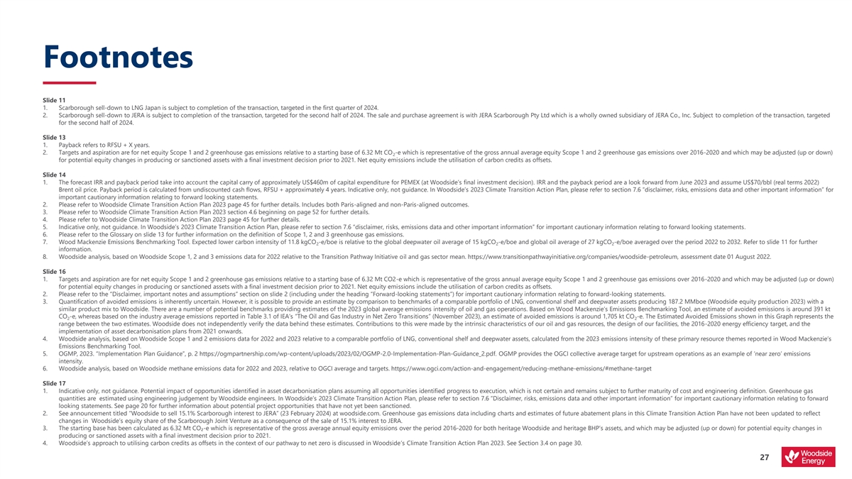 Footnotes Slide 11 1. Scarborough sell-down to LNG Japan is subject to completion of the transaction, targeted in the first quarter of 2024. 2. Scarborough sell-down to JERA is subject to completion of the transaction, targeted for the second half of 2024. The sale and purchase agreement is with JERA Scarborough Pty Ltd which is a wholly owned subsidiary of JERA Co., Inc. Subject to completion of the transaction, targeted for the second half of 2024. Slide 13 1. Payback refers to RFSU + X years. 2. Targets and aspiration are for net equity Scope 1 and 2 greenhouse gas emissions relative to a starting base of 6.32 Mt CO -e which is representative of the gross annual average equity Scope 1 and 2 greenhouse gas emissions over 2016-2020 and which may be adjusted (up or down) 2 for potential equity changes in producing or sanctioned assets with a final investment decision prior to 2021. Net equity emissions include the utilisation of carbon credits as offsets. Slide 14 1. The forecast IRR and payback period take into account the capital carry of approximately US$460m of capital expenditure for PEMEX (at Woodside’s final investment decision). IRR and the payback period are a look forward from June 2023 and assume US$70/bbl (real terms 2022) Brent oil price. Payback period is calculated from undiscounted cash flows, RFSU + approximately 4 years. Indicative only, not guidance. In Woodside’s 2023 Climate Transition Action Plan, please refer to section 7.6 “disclaimer, risks, emissions data and other important information” for important cautionary information relating to forward looking statements. 2. Please refer to Woodside Climate Transition Action Plan 2023 page 45 for further details. Includes both Paris-aligned and non-Paris-aligned outcomes. 3. Please refer to Woodside Climate Transition Action Plan 2023 section 4.6 beginning on page 52 for further details. 4. Please refer to Woodside Climate Transition Action Plan 2023 page 45 for further details. 5. Indicative only, not guidance. In Woodside’s 2023 Climate Transition Action Plan, please refer to section 7.6 “disclaimer, risks, emissions data and other important information” for important cautionary information relating to forward looking statements. 6. Please refer to the Glossary on slide 13 for further information on the definition of Scope 1, 2 and 3 greenhouse gas emissions. 7. Wood Mackenzie Emissions Benchmarking Tool. Expected lower carbon intensity of 11.8 kgCO -e/boe is relative to the global deepwater oil average of 15 kgCO -e/boe and global oil average of 27 kgCO -e/boe averaged over the period 2022 to 2032. Refer to slide 11 for further 2 2 2 information. 8. Woodside analysis, based on Woodside Scope 1, 2 and 3 emissions data for 2022 relative to the Transition Pathway Initiative oil and gas sector mean. https://www.transitionpathwayinitiative.org/companies/woodside-petroleum, assessment date 01 August 2022. Slide 16 1. Targets and aspiration are for net equity Scope 1 and 2 greenhouse gas emissions relative to a starting base of 6.32 Mt CO2-e which is representative of the gross annual average equity Scope 1 and 2 greenhouse gas emissions over 2016-2020 and which may be adjusted (up or down) for potential equity changes in producing or sanctioned assets with a final investment decision prior to 2021. Net equity emissions include the utilisation of carbon credits as offsets. 2. Please refer to the “Disclaimer, important notes and assumptions” section on slide 2 (including under the heading “Forward-looking statements”) for important cautionary information relating to forward-looking statements. 3. Quantification of avoided emissions is inherently uncertain. However, it is possible to provide an estimate by comparison to benchmarks of a comparable portfolio of LNG, conventional shelf and deepwater assets producing 187.2 MMboe (Woodside equity production 2023) with a similar product mix to Woodside. There are a number of potential benchmarks providing estimates of the 2023 global average emissions intensity of oil and gas operations. Based on Wood Mackenzie’s Emissions Benchmarking Tool, an estimate of avoided emissions is around 391 kt CO -e, whereas based on the industry average emissions reported in Table 3.1 of IEA’s “The Oil and Gas Industry in Net Zero Transitions” (November 2023), an estimate of avoided emissions is around 1,705 kt CO -e. The Estimated Avoided Emissions shown in this Graph represents the 2 2 range between the two estimates. Woodside does not independently verify the data behind these estimates. Contributions to this were made by the intrinsic characteristics of our oil and gas resources, the design of our facilities, the 2016-2020 energy efficiency target, and the implementation of asset decarbonisation plans from 2021 onwards. 4. Woodside analysis, based on Woodside Scope 1 and 2 emissions data for 2022 and 2023 relative to a comparable portfolio of LNG, conventional shelf and deepwater assets, calculated from the 2023 emissions intensity of these primary resource themes reported in Wood Mackenzie’s Emissions Benchmarking Tool. 5. OGMP, 2023. “Implementation Plan Guidance”, p. 2 https://ogmpartnership.com/wp-content/uploads/2023/02/OGMP-2.0-Implementation-Plan-Guidance_2.pdf. OGMP provides the OGCI collective average target for upstream operations as an example of ‘near zero’ emissions intensity. 6. Woodside analysis, based on Woodside methane emissions data for 2022 and 2023, relative to OGCI average and targets. https://www.ogci.com/action-and-engagement/reducing-methane-emissions/#methane-target Slide 17 1. Indicative only, not guidance. Potential impact of opportunities identified in asset decarbonisation plans assuming all opportunities identified progress to execution, which is not certain and remains subject to further maturity of cost and engineering definition. Greenhouse gas quantities are estimated using engineering judgement by Woodside engineers. In Wo