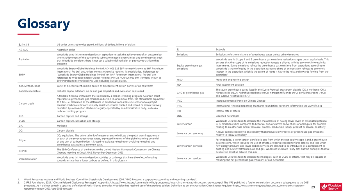 Glossary $, $m, $B US dollar unless otherwise stated, millions of dollars, billions of dollars A$, AUD Australian dollar EJ Exajoule Woodside uses this term to describe an aspiration to seek the achievement of an outcome but Emissions Emissions refers to emissions of greenhouse gases unless otherwise stated where achievement of the outcome is subject to material uncertainties and contingencies such Aspiration Woodside sets its Scope 1 and 2 greenhouse gas emissions reduction targets on an equity basis. This that Woodside considers there is not yet a suitable defined plan or pathway to achieve that ensures that the scope of its emissions reduction targets is aligned with its economic interest in its outcome Equity greenhouse gas investments. Equity emissions reflect the greenhouse gas emissions from operations according to Woodside Energy Global Holdings Pty Ltd ACN 006 923 897 (formerly known as BHP Petroleum emissions Woodside’s share of equity in the operation. Its equity share of an operation reflects its economic International Pty Ltd) and, unless context otherwise requires, its subsidiaries. References to interest in the operation, which is the extent of rights it has to the risks and rewards flowing from the 1 BHPP “Woodside Energy Global Holdings Pty Ltd” or “BHP Petroleum International Pty Ltd” are operation references to Woodside Energy Global Holdings Pty Ltd ACN 006 923 897 (formerly known as FEED Front-end engineering design BHP Petroleum International Pty Ltd) excluding its subsidiaries. FID Final investment decision boe, MMboe, Bboe Barrel of oil equivalent, million barrels of oil equivalent, billion barrels of oil equivalent The seven greenhouse gases listed in the Kyoto Protocol are: carbon dioxide (CO ); methane (CH ); 2 4 Capital expenditure Includes capital additions on oil and gas properties and evaluation capitalised GHG or greenhouse gas nitrous oxide (N O); hydrofluorocarbons (HFCs); nitrogen trifluoride (NF ); perfluorocarbons (PFCs); 2 3 2 and sulphur hexafluoride (SF ) A tradable financial instrument that is issued by a carbon-crediting program. A carbon credit 6 represents a greenhouse gas emission reduction to, or removal from, the atmosphere equivalent IPCC Intergovernmental Panel on Climate Change to 1 tCO₂-e, calculated as the difference in emissions from a baseline scenario to a project Carbon credit scenario. Carbon credits are uniquely serialised, issued, tracked and retired or administratively IFRS International Financial Reporting Standards Foundation. For more information see www.ifrs.org cancelled by means of an electronic registry operated by an administrative body, such as a IRR Internal rate of return carbon-crediting program. CCS Carbon capture and storage LNG Liquefied natural gas CCUS Carbon capture, utilisation and storage Woodside uses this term to describe the characteristic of having lower levels of associated potential Lower carbon GHG emissions when compared to historical and/or current conventions or analogues, for example CH Methane 4 relating to an otherwise similar resource, process, production facility, product or service, or activity CO Carbon dioxide 2 A lower carbon economy is an economy that produces lower levels of greenhouse gas emissions Lower carbon economy relative to today’s economy CO₂ equivalent. The universal unit of measurement to indicate the global warming potential of each of the seven greenhouse gases, expressed in terms of the global warming potential CO -e For Woodside, a lower carbon portfolio is one from which the net equity scope 1 and 2 greenhouse 2 of one unit of carbon dioxide. It is used to evaluate releasing (or avoiding releasing) any gas emissions, which includes the use of offsets, are being reduced towards targets, and into which greenhouse gas against a common basis. Lower carbon portfolio new energy products and lower carbon services are planned to be introduced as a complement to existing and new investments in oil and gas. Woodside’s Climate Policy sets out the principles that we The 28th Conference of the Parties to the United Nations Framework Convention on Climate COP28 believe will assist us achieve this aim Change, meeting in Dubai, UAE, November-December 2023 Woodside uses this term to describe technologies, such as CCUS or offsets, that may be capable of Woodside uses this term to describe activities or pathways that have the effect of moving Lower carbon services Decarbonisation reducing the net greenhouse gas emissions of our customers towards a state that is lower carbon, as defined in this glossary 1. World Resources Institute and World Business Council for Sustainable Development 2004. “GHG Protocol: a corporate accounting and reporting standard”. 2. 2 IFRS Foundation, 2021. “Climate Related Disclosures Prototype”, Appendix A. https://www.ifrs.org/content/dam/ifrs/groups/trwg/trwg-climate-related-disclosures-prototype.pdf The IFRS published a further consultation document subsequent to the 2021 prototype. As it did not contain a updated definition of Paris-Aligned scenarios Woodside has retained use of the previous edition. Definition as per the Australian Clean Energy Regulator https://www.cleanenergyregulator.gov.au/Infohub/Markets/cert- 29 report/cert-report-2023/cert-2023-glossary