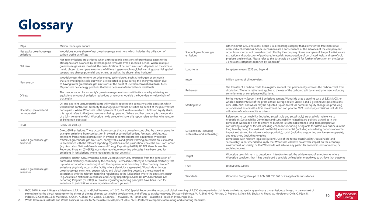 Glossary Other indirect GHG emissions. Scope 3 is a reporting category that allows for the treatment of all Mtpa Million tonnes per annum other indirect emissions. Scope 3 emissions are a consequence of the activities of the company, but Net equity greenhouse gas Woodside’s equity share of net greenhouse gas emissions which includes the utilisation of Scope 3 greenhouse gas occur from sources not owned or controlled by the company. Some examples of Scope 3 activities are emissions carbon credits as offsets emissions extraction and production of purchased materials; transportation of purchased fuels; and use of sold products and services. Please refer to the data table on page 73 for further information on the Scope Net zero emissions are achieved when anthropogenic emissions of greenhouse gases to the 2 3 emissions categories reported by Woodside atmosphere are balanced by anthropogenic removals over a specified period. Where multiple Net zero greenhouse gases are involved, the quantification of net zero emissions depends on the climate metric chosen to compare emissions of different gases (such as global warming potential, global Long-term Long-term means 2036 and beyond 1 temperature change potential, and others, as well as the chosen time horizon) Woodside uses this term to describe energy technologies, such as hydrogen or ammonia, mtoe Million tonnes of oil equivalent that are emerging in scale but which are expected to grow during the energy transition due New energy to having lower greenhouse gas emissions at the point of use than conventional fossil fuels. May include new energy products that have been manufactured from fossil fuels The transfer of a carbon credit to a registry account that permanently removes the carbon credit from Retirement circulation. The term retirement applies to the use of the carbon credit by an entity to meet voluntary The compensation for an entity’s greenhouse gas emissions within its scope by achieving an commitments or compliance obligations. Offsets equivalent amount of emission reductions or removals outside the boundary or value chain of that entity For its net equity Scope 1 and 2 emissions targets, Woodside uses a starting base of 6.32 Mt CO -e 2 which is representative of the gross annual average equity Scope 1 and 2 greenhouse gas emissions Oil and gas joint venture participants will typically appoint one company as the operator, which Starting base over 2016-2020 and which may be adjusted (up or down) for potential equity changes in producing will hold the contractual authority to manage joint venture activities on behalf of the joint venture or sanctioned assets with a final investment decision prior to 2021. Net equity emissions include the Operator, Operated and participants. Where Woodside is the operator of a joint venture in which it holds an equity share, utilisation of carbon credits as offsets. non-operated this report refers to that joint venture as being operated. Where another company is the operator of a joint venture in which Woodside holds an equity share, this report refers to that joint venture References to sustainability (including sustainable and sustainably) are used with reference to as being non-operated Woodside’s Sustainability Committee and sustainability related Board policies, as well as in the context of Woodside’s aim to ensure its business is sustainable from a long-term perspective, RFSU Ready for start-up considering a range of factors including economic (including being able to sustain our business in the long term by being low cost and profitable), environmental (including considering our environmental Direct GHG emissions. These occur from sources that are owned or controlled by the company, for Sustainability (including impact and striving for a lower carbon portfolio), social (including supporting our license to operate), example, emissions from combustion in owned or controlled boilers, furnaces, vehicles, etc.; sustainable and sustainably) and regulatory (including ongoing emissions from chemical production in owned or controlled process equipment. Woodside compliance with relevant legal obligations). Use of the terms ‘sustainability’, ‘sustainable’ and Scope 1 greenhouse gas estimates greenhouse gas emissions, energy values and global warming potentials are estimated ‘sustainably’ is not intended to imply that Woodside will have no adverse impact on the economy, emissions in accordance with the relevant reporting regulations in the jurisdiction where the emissions occur environment, or society, or that Woodside will achieve any particular economic, environmental, or (e.g. Australian National Greenhouse and Energy Reporting (NGER), US EPA Greenhouse Gas social outcomes. Reporting Program (GHGRP)). Australian regulatory reporting principles have been used for 2 emissions in jurisdictions where regulations do not yet exist Woodside uses this term to describe an intention to seek the achievement of an outcome, where Target Electricity indirect GHG emissions. Scope 2 accounts for GHG emissions from the generation of Woodside considers that it has developed a suitably defined plan or pathway to achieve that outcome purchased electricity consumed by the company. Purchased electricity is defined as electricity that is purchased or otherwise brought into the organisational boundary of the company. Scope 2 USD United States dollar emissions physically occur at the facility where electricity is generated. Woodside estimates Scope 2 greenhouse gas greenhouse gas emissions, energy values and global warming potentials are estimated in emissions accordance with the relevant reporting regulations in the jurisdiction where the emissions occur Woodside Woodside Energy Group Ltd ACN 004 898 962 or its applicable subsidiaries (e.g. Australian National Greenhouse and Energy Reporting (NGER), US EPA Greenhouse Gas Reporting Program (GHGRP)). Australian regulatory reporting principles have been used for 2