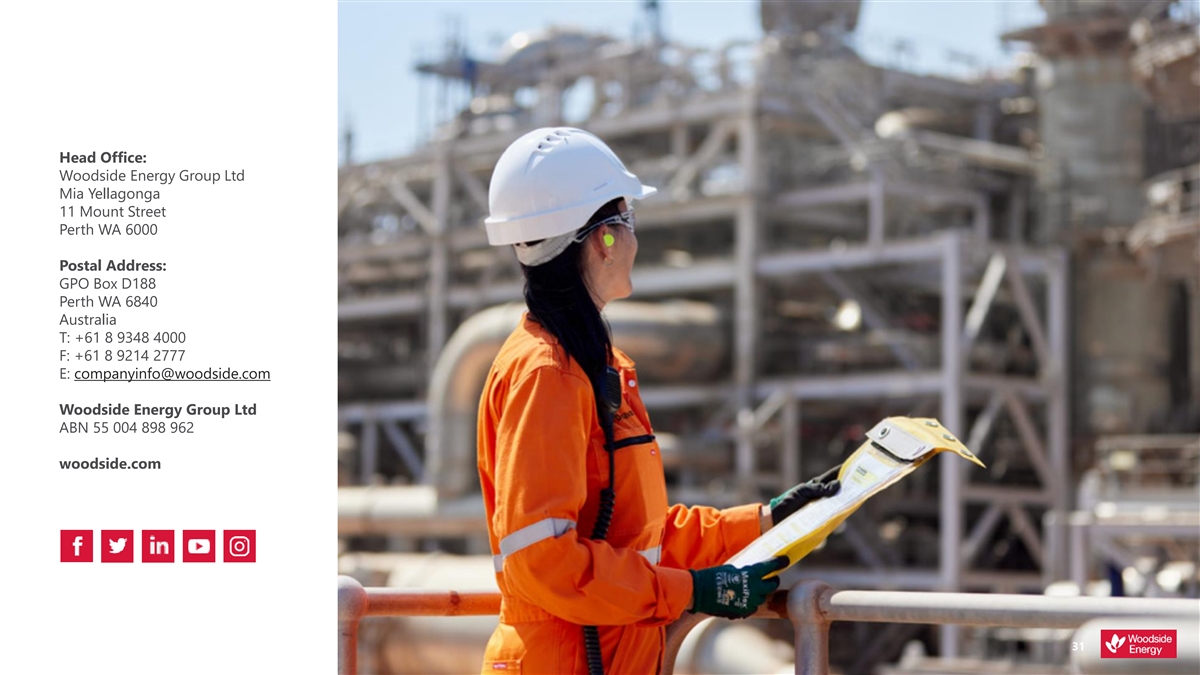Head Office: Woodside Energy Group Ltd Mia Yellagonga 11 Mount Street Perth WA 6000 Postal Address: GPO Box D188 Perth WA 6840 Australia T: +61 8 9348 4000 F: +61 8 9214 2777 E: companyinfo@woodside.com Woodside Energy Group Ltd ABN 55 004 898 962 woodside.com 31