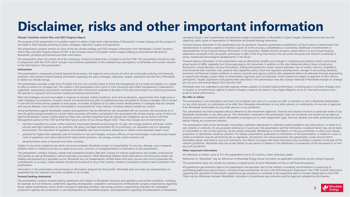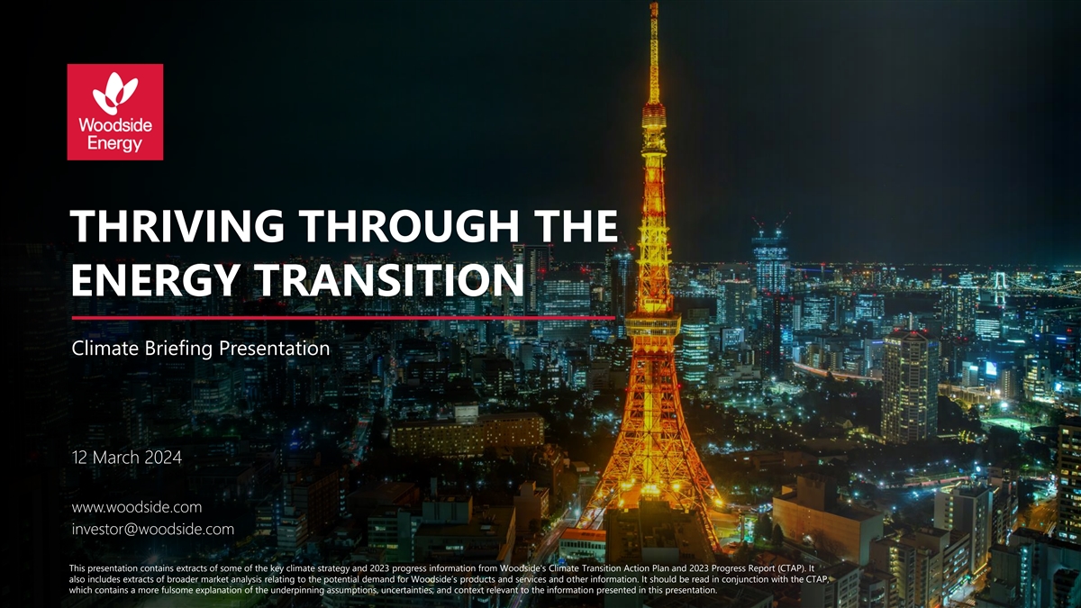 DRAFT 1 MARCH THRIVING THROUGH THE ENERGY TRANSITION Climate Briefing Presentation 12 March 2024 www.woodside.com investor@woodside.com This presentation contains extracts of some of the key climate strategy and 2023 progress information from Woodside's Climate Transition Action Plan and 2023 Progress Report (CTAP). It also includes extracts of broader market analysis relating to the potential demand for Woodside’s products and services and other information. It should be read in conjunction with the CTAP, which contains a more fulsome explanation of the underpinning assumptions, uncertainties, and context relevant to the information presented in this presentation.