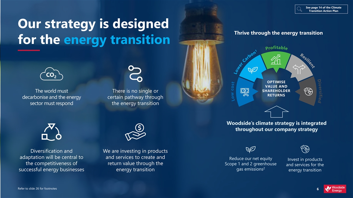 Woodside is built to thrive through the energy transition Firm conviction in sustained demand for our products and services Providing energy through a high-quality portfolio, Geographically advantaged to meet LNG demand in Asia geographically advantaged to meet 1 growing LNG demand Customer investment in Scarborough demonstrates the strength of this demand Customer-led, matching the pace and scale of demand as it evolves Creating and returning value Robust assessments across a range of climate-related factors before investing through disciplined capital management Diversification is a key part of our strategy Conducting our 2 On track to meet our net equity Scope 1 and 2 targets business sustainably New Scope 3 abatement target will track the impact of new energy products on customers’ emissions through contribution to environment and communities 3 Integrity and transparency assessment of carbon credit portfolio Refer to slide 26 for footnotes 5