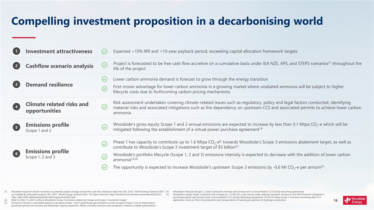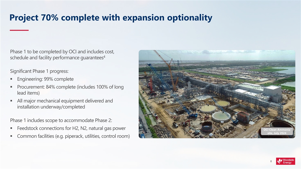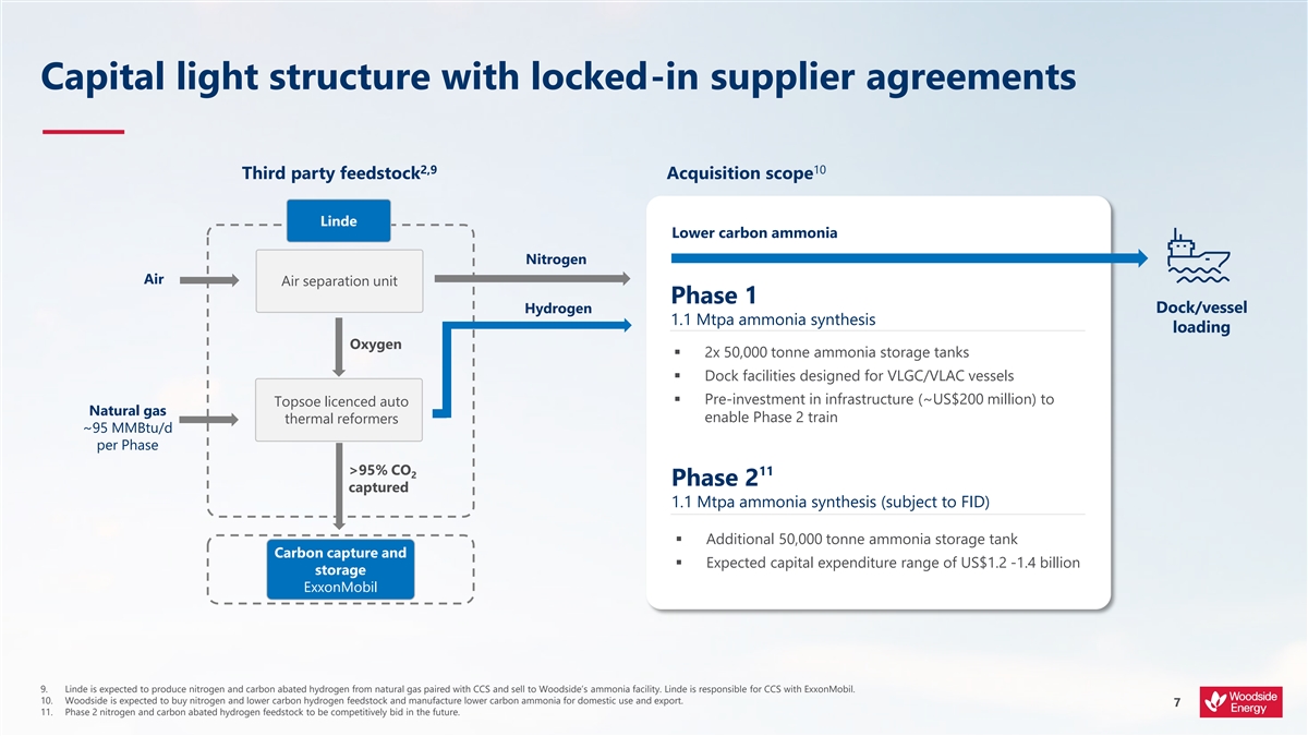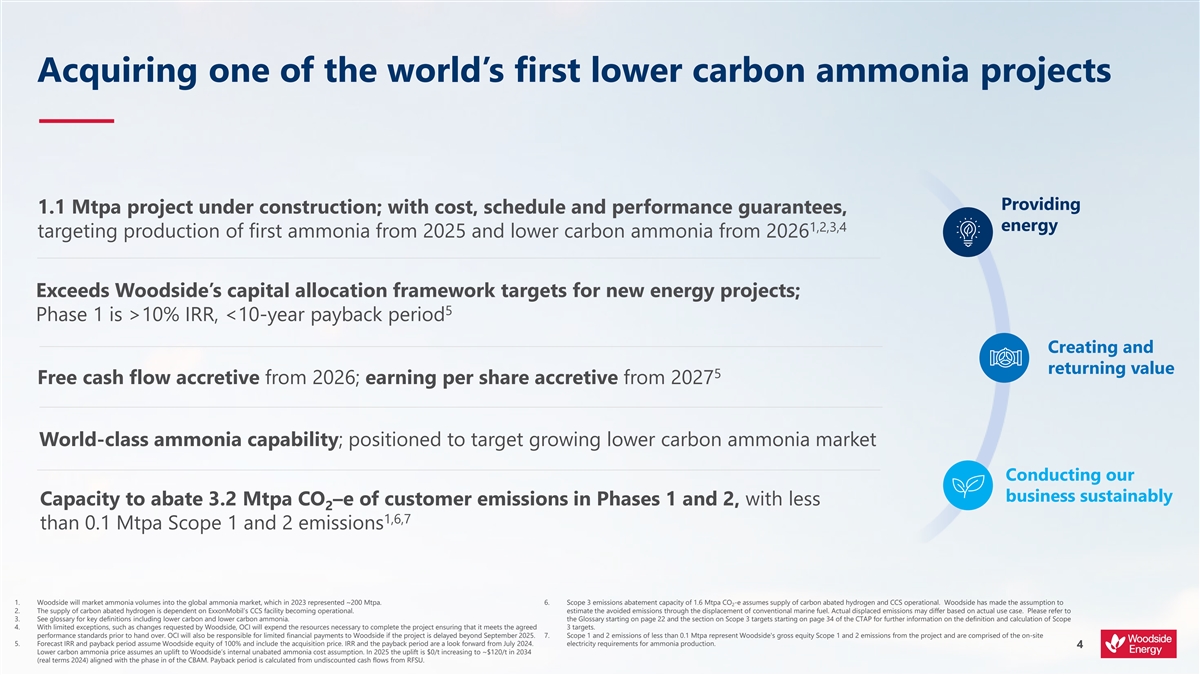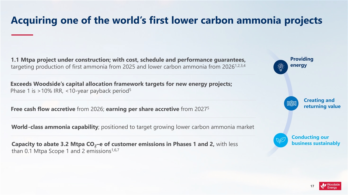 Acquiring one of the world’s first lower carbon ammonia projects Providing 1.1 Mtpa project under construction; with cost, schedule and performance guarantees, 1,2,3,4 energy targeting production of first ammonia from 2025 and lower carbon ammonia from 2026 Exceeds Woodside’s capital allocation framework targets for new energy projects; 5 Phase 1 is >10% IRR, <10-year payback period Creating and returning value 5 Free cash flow accretive from 2026; earning per share accretive from 2027 World-class ammonia capability; positioned to target growing lower carbon ammonia market Conducting our business sustainably Capacity to abate 3.2 Mtpa CO –e of customer emissions in Phases 1 and 2, with less 2 1,6,7 than 0.1 Mtpa Scope 1 and 2 emissions 17
