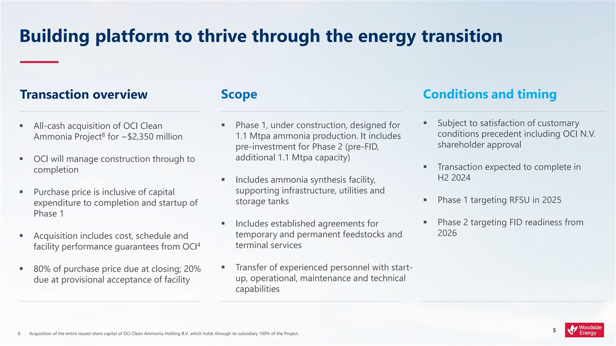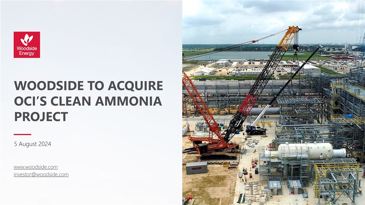 WOODSIDE TO ACQUIRE OCI’S CLEAN AMMONIA PROJECT 5 August 2024 www.woodside.com investor@woodside.com