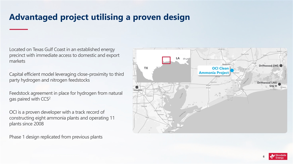 Woodside has entered into a binding agreement to acquire 100% of OCI Clean Ammonia Holding B.V., and its lower carbon ammonia project in Beaumont, Texas (Project) for an all-cash consideration of approximately $2,350 million. The Project is under construction and targets production of first ammonia from 2025 and lower carbon ammonia from 2026. The consideration is inclusive of capital expenditure through completion of the first phase (Phase 1).