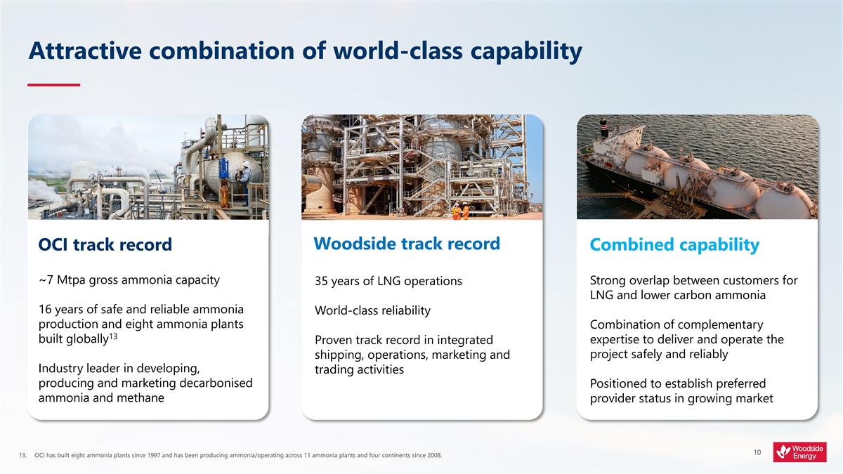 Project schedule 2024 2025 2026 Future 2 Phase 1 (1.1 Mtpa) Construction Ammonia production Lower carbon ammonia production Woodside Acquisition Project completion 80% due (closing) and handover targeted for 2025 20% due H and N supply 2 2 Construction H and N supply 2 2 Linde Feedstock Agreement H and N supply 2 2 H and N supply 2 2 Multiple suppliers 2 Carbon storage Expected start up range Dedicated CCS ExxonMobil Target FID readiness Phase 2 (1.1 Mtpa) 2,12 Lower carbon ammonia production from 2026 Woodside, subject to FID 9 Project schedule as illustrated is indicative only. 12. Phase 2 is expected to be lower carbon ammonia from RFSU, assuming ExxonMobil’s CCS facility is operational.