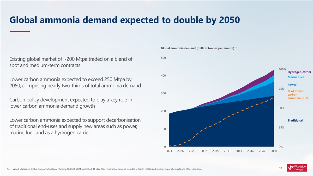 Attractive combination of world-class capability Woodside track record OCI track record Combined capability ~7 Mtpa gross ammonia capacity Strong overlap between customers for 35 years of LNG operations LNG and lower carbon ammonia 16 years of safe and reliable ammonia World-class reliability production and eight ammonia plants Combination of complementary 13 built globally expertise to deliver and operate the Proven track record in integrated project safely and reliably shipping, operations, marketing and Industry leader in developing, trading activities producing and marketing decarbonised Positioned to establish preferred ammonia and methane provider status in growing market 10 13. OCI has built eight ammonia plants since 1997 and has been producing ammonia/operating across 11 ammonia plants and four continents since 2008.