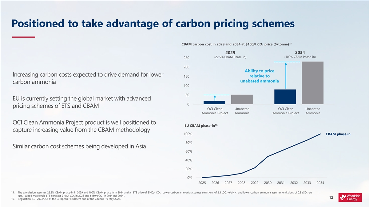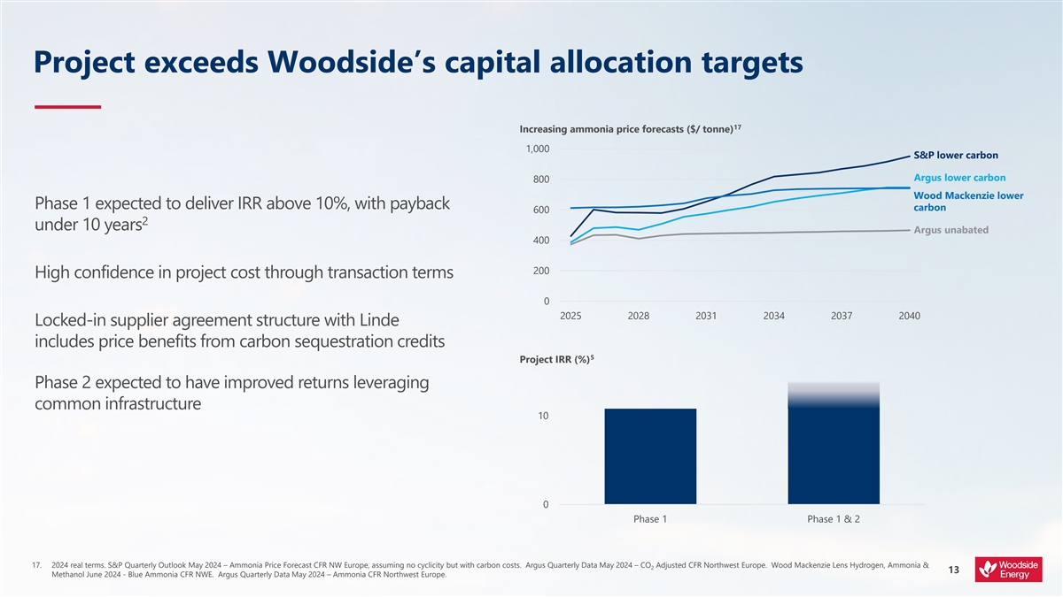 Forecast IRR and payback period are a look forward from July 2024 and assume Woodside equity of 100% and include the acquisition price. Lower carbon ammonia price assumes an uplift to Woodside’s internal unabated ammonia cost assumption. In 2025 the uplift is $0/t increasing to ~$120/t in 2034 (real terms 2024) aligned with the phase-in of the EU carbon border adjustment mechanism (CBAM). Payback period is calculated from undiscounted cash flows from ready for start up (RFSU).