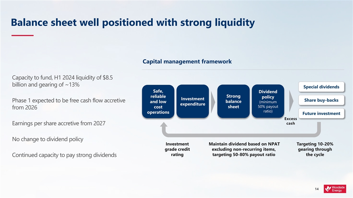 Balance sheet well positioned with strong liquidity Capital management framework Capacity to fund, H1 2024 liquidity of $8.5 billion and gearing of ~13% Special dividends Safe, Dividend Strong reliable policy Investment Share buy-backs Phase 1 expected to be free cash flow accretive and low balance (minimum expenditure 50% payout sheet cost from 2026 ratio) operations Future investment Excess cash Earnings per share accretive from 2027 No change to dividend policy Investment Maintain dividend based on NPAT Targeting 10-20% grade credit excluding non-recurring items, gearing through rating targeting 50-80% payout ratio the cycle Continued capacity to pay strong dividends 14