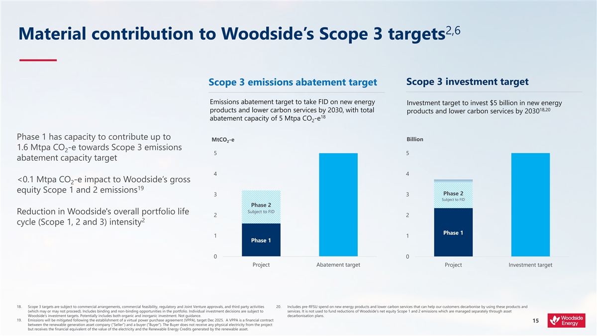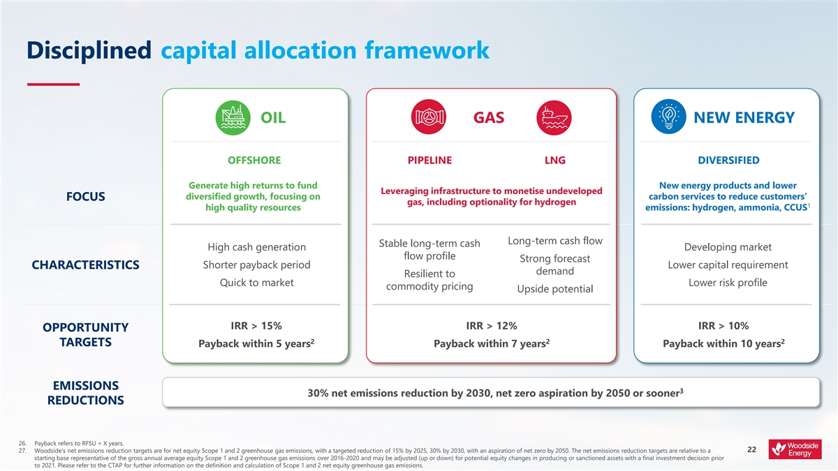 Scope 3 targets are subject to commercial arrangements, commercial feasibility, regulatory and joint venture approvals, and third party activities (which may or may not proceed). Individual investment decisions are subject to Woodside’s investment targets. Not guidance. It potentially includes both organic and inorganic investment. For further information on Woodside’s Scope 3 targets refer to pages 7 and 34 of the CTAP.