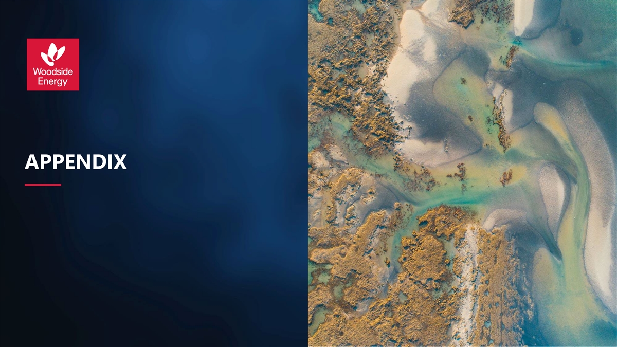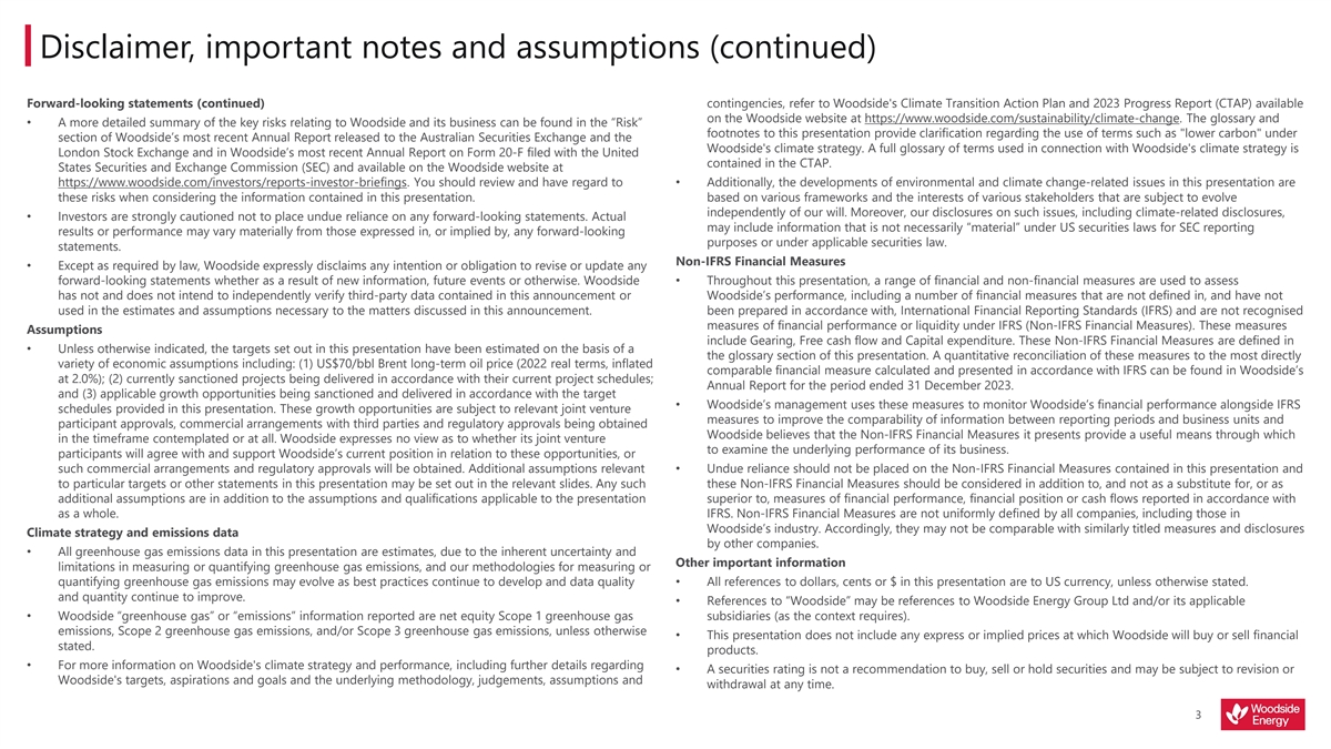 Disclaimer, important notes and assumptions (continued) Forward-looking statements (continued) contingencies, refer to Woodside's Climate Transition Action Plan and 2023 Progress Report (CTAP) available on the Woodside website at https://www.woodside.com/sustainability/climate-change. The glossary and • A more detailed summary of the key risks relating to Woodside and its business can be found in the “Risk” footnotes to this presentation provide clarification regarding the use of terms such as lower carbon under section of Woodside’s most recent Annual Report released to the Australian Securities Exchange and the Woodside's climate strategy. A full glossary of terms used in connection with Woodside's climate strategy is London Stock Exchange and in Woodside’s most recent Annual Report on Form 20-F filed with the United contained in the CTAP. States Securities and Exchange Commission (SEC) and available on the Woodside website at https://www.woodside.com/investors/reports-investor-briefings. You should review and have regard to • Additionally, the developments of environmental and climate change-related issues in this presentation are these risks when considering the information contained in this presentation. based on various frameworks and the interests of various stakeholders that are subject to evolve independently of our will. Moreover, our disclosures on such issues, including climate-related disclosures, • Investors are strongly cautioned not to place undue reliance on any forward-looking statements. Actual may include information that is not necessarily “material” under US securities laws for SEC reporting results or performance may vary materially from those expressed in, or implied by, any forward-looking purposes or under applicable securities law. statements. Non-IFRS Financial Measures • Except as required by law, Woodside expressly disclaims any intention or obligation to revise or update any forward-looking statements whether as a result of new information, future events or otherwise. Woodside • Throughout this presentation, a range of financial and non-financial measures are used to assess has not and does not intend to independently verify third-party data contained in this announcement or Woodside’s performance, including a number of financial measures that are not defined in, and have not used in the estimates and assumptions necessary to the matters discussed in this announcement. been prepared in accordance with, International Financial Reporting Standards (IFRS) and are not recognised measures of financial performance or liquidity under IFRS (Non-IFRS Financial Measures). These measures Assumptions include Gearing, Free cash flow and Capital expenditure. These Non-IFRS Financial Measures are defined in • Unless otherwise indicated, the targets set out in this presentation have been estimated on the basis of a the glossary section of this presentation. A quantitative reconciliation of these measures to the most directly variety of economic assumptions including: (1) US$70/bbl Brent long-term oil price (2022 real terms, inflated comparable financial measure calculated and presented in accordance with IFRS can be found in Woodside’s at 2.0%); (2) currently sanctioned projects being delivered in accordance with their current project schedules; Annual Report for the period ended 31 December 2023. and (3) applicable growth opportunities being sanctioned and delivered in accordance with the target • Woodside’s management uses these measures to monitor Woodside’s financial performance alongside IFRS schedules provided in this presentation. These growth opportunities are subject to relevant joint venture measures to improve the comparability of information between reporting periods and business units and participant approvals, commercial arrangements with third parties and regulatory approvals being obtained Woodside believes that the Non-IFRS Financial Measures it presents provide a useful means through which in the timeframe contemplated or at all. Woodside expresses no view as to whether its joint venture to examine the underlying performance of its business. participants will agree with and support Woodside’s current position in relation to these opportunities, or such commercial arrangements and regulatory approvals will be obtained. Additional assumptions relevant • Undue reliance should not be placed on the Non-IFRS Financial Measures contained in this presentation and to particular targets or other statements in this presentation may be set out in the relevant slides. Any such these Non-IFRS Financial Measures should be considered in addition to, and not as a substitute for, or as additional assumptions are in addition to the assumptions and qualifications applicable to the presentation superior to, measures of financial performance, financial position or cash flows reported in accordance with as a whole. IFRS. Non-IFRS Financial Measures are not uniformly defined by all companies, including those in Woodside’s industry. Accordingly, they may not be comparable with similarly titled measures and disclosures Climate strategy and emissions data by other companies. • All greenhouse gas emissions data in this presentation are estimates, due to the inherent uncertainty and Other important information limitations in measuring or quantifying greenhouse gas emissions, and our methodologies for measuring or quantifying greenhouse gas emissions may evolve as best practices continue to develop and data quality • All references to dollars, cents or $ in this presentation are to US currency, unless otherwise stated. and quantity continue to improve. • References to “Woodside” may be references to Woodside Energy Group Ltd and/or its applicable • Woodside “greenhouse gas” or “emissions” information reported are net equity Scope 1 greenhouse gas subsidiaries (as the context requires). emissions, Scope 2 greenhouse gas emissi