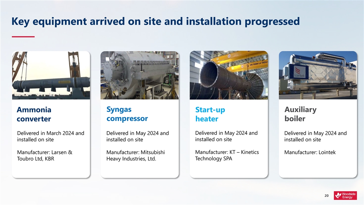 Key equipment arrived on site and installation progressed Syngas Auxiliary Ammonia Start-up compressor boiler converter heater Delivered in May 2024 and Delivered in March 2024 and Delivered in May 2024 and Delivered in May 2024 and installed on site installed on site installed on site installed on site Manufacturer: Larsen & Manufacturer: Mitsubishi Manufacturer: KT – Kinetics Manufacturer: Lointek Technology SPA Toubro Ltd, KBR Heavy Industries, Ltd. 20
