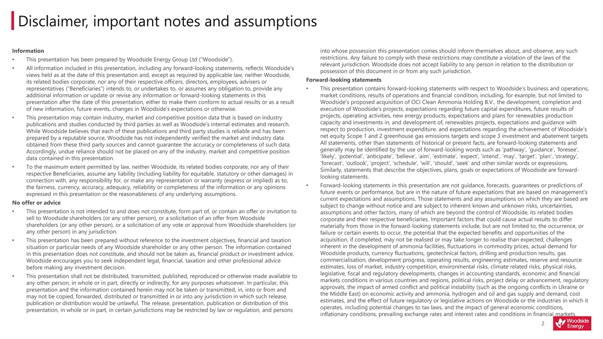 Disclaimer, important notes and assumptions Information into whose possession this presentation comes should inform themselves about, and observe, any such restrictions. Any failure to comply with these restrictions may constitute a violation of the laws of the • This presentation has been prepared by Woodside Energy Group Ltd (“Woodside”). relevant jurisdiction. Woodside does not accept liability to any person in relation to the distribution or • All information included in this presentation, including any forward-looking statements, reflects Woodside’s possession of this document in or from any such jurisdiction. views held as at the date of this presentation and, except as required by applicable law, neither Woodside, Forward-looking statements its related bodies corporate, nor any of their respective officers, directors, employees, advisers or representatives (“Beneficiaries”) intends to, or undertakes to, or assumes any obligation to, provide any • This presentation contains forward-looking statements with respect to Woodside’s business and operations, additional information or update or revise any information or forward-looking statements in this market conditions, results of operations and financial condition, including, for example, but not limited to presentation after the date of this presentation, either to make them conform to actual results or as a result Woodside's proposed acquisition of OCI Clean Ammonia Holding B.V., the development, completion and of new information, future events, changes in Woodside’s expectations or otherwise. execution of Woodside’s projects, expectations regarding future capital expenditures, future results of projects, operating activities, new energy products, expectations and plans for renewables production • This presentation may contain industry, market and competitive position data that is based on industry capacity and investments in, and development of, renewables projects, expectations and guidance with publications and studies conducted by third parties as well as Woodside’s internal estimates and research. respect to production, investment expenditure, and expectations regarding the achievement of Woodside’s While Woodside believes that each of these publications and third party studies is reliable and has been net equity Scope 1 and 2 greenhouse gas emissions targets and scope 3 investment and abatement targets. prepared by a reputable source, Woodside has not independently verified the market and industry data All statements, other than statements of historical or present facts, are forward-looking statements and obtained from these third party sources and cannot guarantee the accuracy or completeness of such data. generally may be identified by the use of forward-looking words such as ‘pathway’, ‘guidance’, ‘foresee’, Accordingly, undue reliance should not be placed on any of the industry, market and competitive position ‘likely’, ‘potential’, ‘anticipate’, ‘believe’, ‘aim’, ‘estimate’, ‘expect’, ‘intend’, ‘may’, ‘target’, ‘plan’, ‘strategy’, data contained in this presentation. ‘forecast’, ‘outlook’, ‘project’, ‘schedule’, ‘will’, ‘should’, ‘seek’ and other similar words or expressions. • To the maximum extent permitted by law, neither Woodside, its related bodies corporate, nor any of their Similarly, statements that describe the objectives, plans, goals or expectations of Woodside are forward- respective Beneficiaries, assume any liability (including liability for equitable, statutory or other damages) in looking statements. connection with, any responsibility for, or make any representation or warranty (express or implied) as to, • Forward-looking statements in this presentation are not guidance, forecasts, guarantees or predictions of the fairness, currency, accuracy, adequacy, reliability or completeness of the information or any opinions future events or performance, but are in the nature of future expectations that are based on management’s expressed in this presentation or the reasonableness of any underlying assumptions. current expectations and assumptions. Those statements and any assumptions on which they are based are No offer or advice subject to change without notice and are subject to inherent known and unknown risks, uncertainties, • This presentation is not intended to and does not constitute, form part of, or contain an offer or invitation to assumptions and other factors, many of which are beyond the control of Woodside, its related bodies sell to Woodside shareholders (or any other person), or a solicitation of an offer from Woodside corporate and their respective beneficiaries. Important factors that could cause actual results to differ shareholders (or any other person), or a solicitation of any vote or approval from Woodside shareholders (or materially from those in the forward-looking statements include, but are not limited to, the occurrence, or any other person) in any jurisdiction. failure or certain events to occur, the potential that the expected benefits and opportunities of the acquisition, if completed, may not be realised or may take longer to realise than expected; challenges • This presentation has been prepared without reference to the investment objectives, financial and taxation inherent in the development of ammonia facilities, fluctuations in commodity prices, actual demand for situation or particular needs of any Woodside shareholder or any other person. The information contained Woodside products, currency fluctuations, geotechnical factors, drilling and production results, gas in this presentation does not constitute, and should not be taken as, financial product or investment advice. commercialisation, development progress, operating results, engineering estimates, reserve and resource Woodside encourages you to seek independent legal, financial, taxation and other 