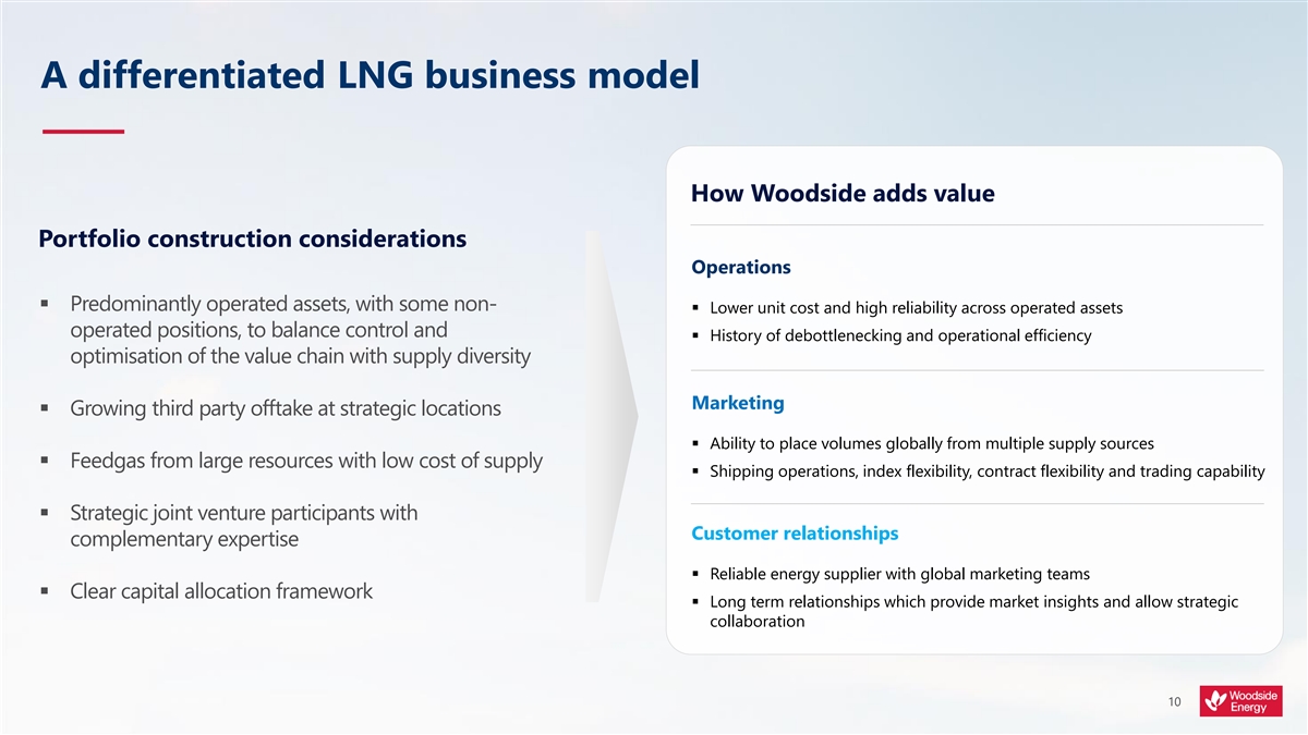 Delivering near term growth through large scale projects Trion Sangomar Scarborough FPSO facility, located offshore Senegal 8 Mtpa LNG project capacity (100%) FPU facility, offshore Mexico, with oil plus domestic gas, located offshore production capacity of 100,000 First oil achieved in June 2024; achieved Western Australia barrels/day nameplate capacity of 100,000 bbl/day in July 2024 67% complete and on track for first Approaching 10% complete and on 1 1 LNG cargo in 2026 track for first oil in 2028 9 1. As at 30 June 2024. Scarborough percentage of completeness excludes Train 1 modifications.