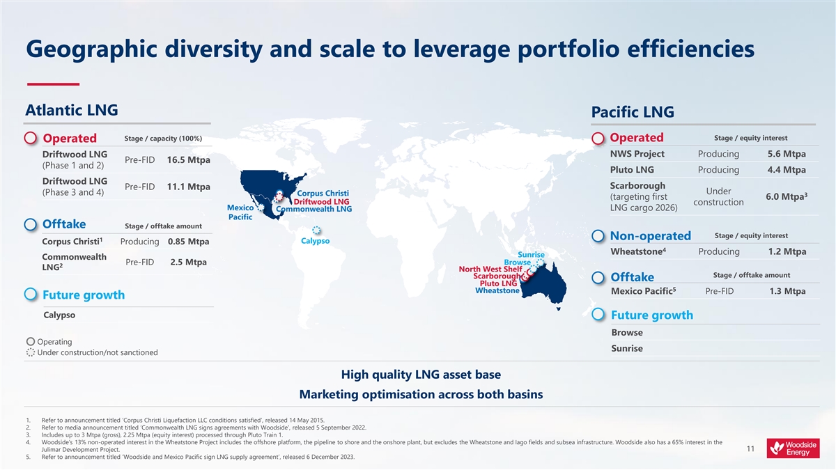 A differentiated LNG business model How Woodside adds value Portfolio construction considerations Operations ▪ Predominantly operated assets, with some non- ▪ Lower unit cost and high reliability across operated assets operated positions, to balance control and ▪ History of debottlenecking and operational efficiency optimisation of the value chain with supply diversity Marketing ▪ Growing third party offtake at strategic locations ▪ Ability to place volumes globally from multiple supply sources ▪ Feedgas from large resources with low cost of supply ▪ Shipping operations, index flexibility, contract flexibility and trading capability ▪ Strategic joint venture participants with Customer relationships complementary expertise ▪ Reliable energy supplier with global marketing teams ▪ Clear capital allocation framework ▪ Long term relationships which provide market insights and allow strategic collaboration 10