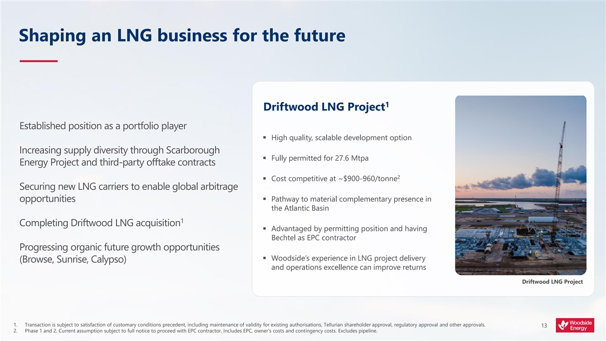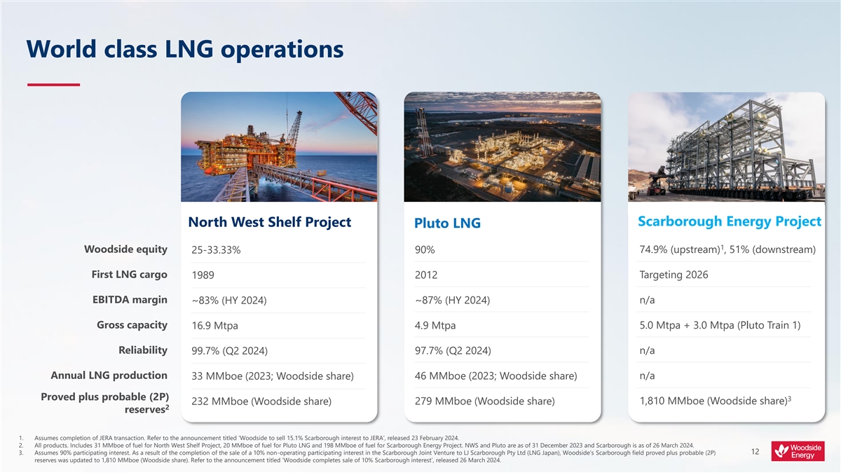 World class LNG operations Scarborough Energy Project North West Shelf Project Pluto LNG 1 Woodside equity 90% 74.9% (upstream) , 51% (downstream) 25-33.33% First LNG cargo 1989 2012 Targeting 2026 EBITDA margin ~83% (HY 2024) ~87% (HY 2024) n/a Gross capacity 5.0 Mtpa + 3.0 Mtpa (Pluto Train 1) 16.9 Mtpa 4.9 Mtpa Reliability n/a 99.7% (Q2 2024) 97.7% (Q2 2024) Annual LNG production 46 MMboe (2023; Woodside share) n/a 33 MMboe (2023; Woodside share) Proved plus probable (2P) 3 232 MMboe (Woodside share) 279 MMboe (Woodside share) 1,810 MMboe (Woodside share) 2 reserves 1. Assumes completion of JERA transaction. Refer to the announcement titled ‘Woodside to sell 15.1% Scarborough interest to JERA’, released 23 February 2024. 2. All products. Includes 31 MMboe of fuel for North West Shelf Project, 20 MMboe of fuel for Pluto LNG and 198 MMboe of fuel for Scarborough Energy Project. NWS and Pluto are as of 31 December 2023 and Scarborough is as of 26 March 2024. 3. Assumes 90% participating interest. As a result of the completion of the sale of a 10% non-operating participating interest in the Scarborough Joint Venture to LJ Scarborough Pty Ltd (LNG Japan), Woodside’s Scarborough field proved plus probable (2P) 12 reserves was updated to 1,810 MMboe (Woodside share). Refer to the announcement titled ‘Woodside completes sale of 10% Scarborough interest’, released 26 March 2024.