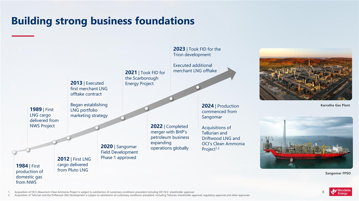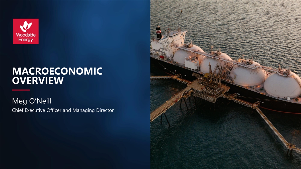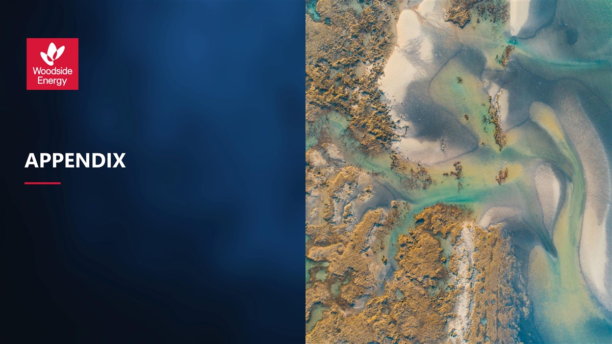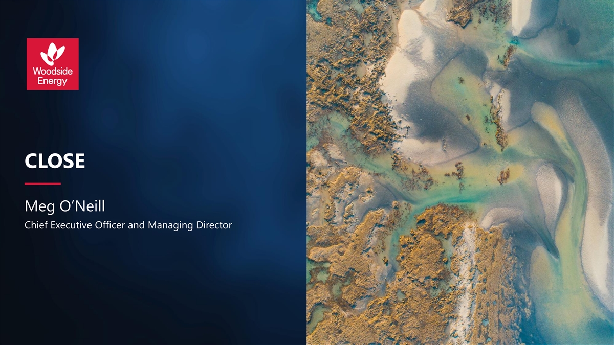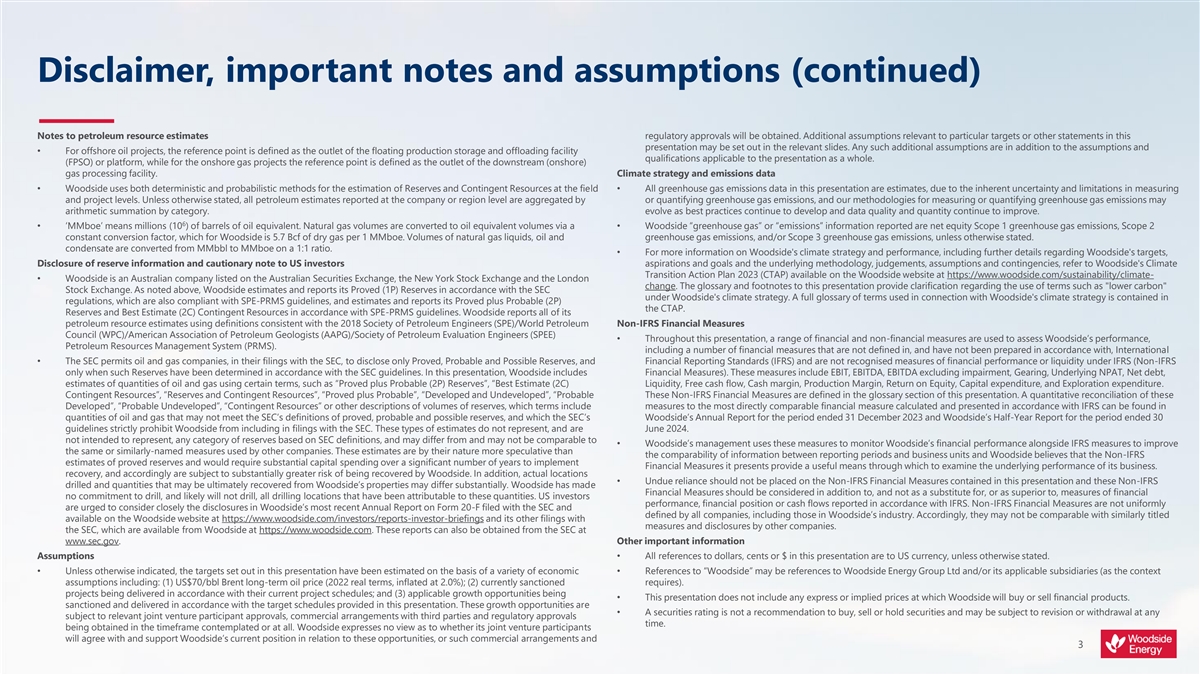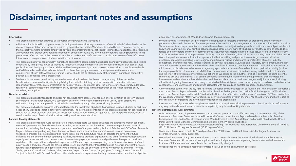 Disclaimer, important notes and assumptions Information plans, goals or expectations of Woodside are forward-looking statements. • This presentation has been prepared by Woodside Energy Group Ltd (“Woodside”).• Forward-looking statements in this presentation are not guidance, forecasts, guarantees or predictions of future events or performance, but are in the nature of future expectations that are based on management’s current expectations and assumptions. • All information included in this presentation, including any forward-looking statements, reflects Woodside’s views held as at the Those statements and any assumptions on which they are based are subject to change without notice and are subject to inherent date of this presentation and, except as required by applicable law, neither Woodside, its related bodies corporate, nor any of known and unknown risks, uncertainties, assumptions and other factors, many of which are beyond the control of Woodside, its their respective officers, directors, employees, advisers or representatives (“Beneficiaries”) intends to, or undertakes to, or assumes related bodies corporate and their respective Beneficiaries. Important factors that could cause actual results to differ materially any obligation to, provide any additional information or update or revise any information or forward-looking statements in this from those in the forward-looking statements include, but are not limited to, fluctuations in commodity prices, actual demand for presentation after the date of this presentation, either to make them conform to actual results or as a result of new information, Woodside products, currency fluctuations, geotechnical factors, drilling and production results, gas commercialisation, future events, changes in Woodside’s expectations or otherwise. development progress, operating results, engineering estimates, reserve and resource estimates, loss of market, industry • This presentation may contain industry, market and competitive position data that is based on industry publications and studies competition, environmental risks, climate related risks, physical risks, legislative, fiscal and regulatory developments, changes in conducted by third parties as well as Woodside’s internal estimates and research. While Woodside believes that each of these accounting standards, economic and financial markets conditions in various countries and regions, political risks, the actions of publications and third party studies is reliable and has been prepared by a reputable source, Woodside has not independently third parties, project delay or advancement, regulatory approvals, the impact of armed conflict and political instability (such as verified the market and industry data obtained from these third party sources and cannot guarantee the accuracy or the ongoing conflict in Ukraine and the Middle East) on economic activity and oil and gas supply and demand, cost estimates, completeness of such data. Accordingly, undue reliance should not be placed on any of the industry, market and competitive and the effect of future regulatory or legislative actions on Woodside or the industries in which it operates, including potential position data contained in this presentation. changes to tax laws, and the impact of general economic conditions, inflationary conditions, prevailing exchange rates and • To the maximum extent permitted by law, neither Woodside, its related bodies corporate, nor any of their respective interest rates and conditions in financial markets and risks associated with acquisitions, mergers and joint ventures, including Beneficiaries, assume any liability (including liability for equitable, statutory or other damages) in connection with, any difficulties integrating businesses, uncertainty associated with financial projections, restructuring, increased costs and adverse tax responsibility for, or make any representation or warranty (express or implied) as to, the fairness, currency, accuracy, adequacy, consequences, and uncertainties and liabilities associated with acquired and divested properties and businesses. reliability or completeness of the information or any opinions expressed in this presentation or the reasonableness of any • A more detailed summary of the key risks relating to Woodside and its business can be found in the “Risk” section of Woodside’s underlying assumptions. most recent Annual Report released to the Australian Securities Exchange and the London Stock Exchange and in Woodside’s No offer or advice most recent Annual Report on Form 20-F filed with the United States Securities and Exchange Commission (SEC) and available on the Woodside website at https://www.woodside.com/investors/reports-investor-briefings. You should review and have regard to • This presentation is not intended to and does not constitute, form part of, or contain an offer or invitation to sell to Woodside these risks when considering the information contained in this presentation. shareholders (or any other person), or a solicitation of an offer from Woodside shareholders (or any other person), or a solicitation of any vote or approval from Woodside shareholders (or any other person) in any jurisdiction. • Investors are strongly cautioned not to place undue reliance on any forward-looking statements. Actual results or performance may vary materially from those expressed in, or implied by, any forward-looking statements. • This presentation has been prepared without reference to the investment objectives, financial and taxation situation or particular needs of any Woodside shareholder or any other person. The information contained in this presentation does not constitute, and Notes to petroleum resource estimates should not be taken as, financial product or investment advice. Woodside encourages you to seek independent legal, financial, • Unless otherwise stated, all petroleum resource estimates are quoted as at the effect
