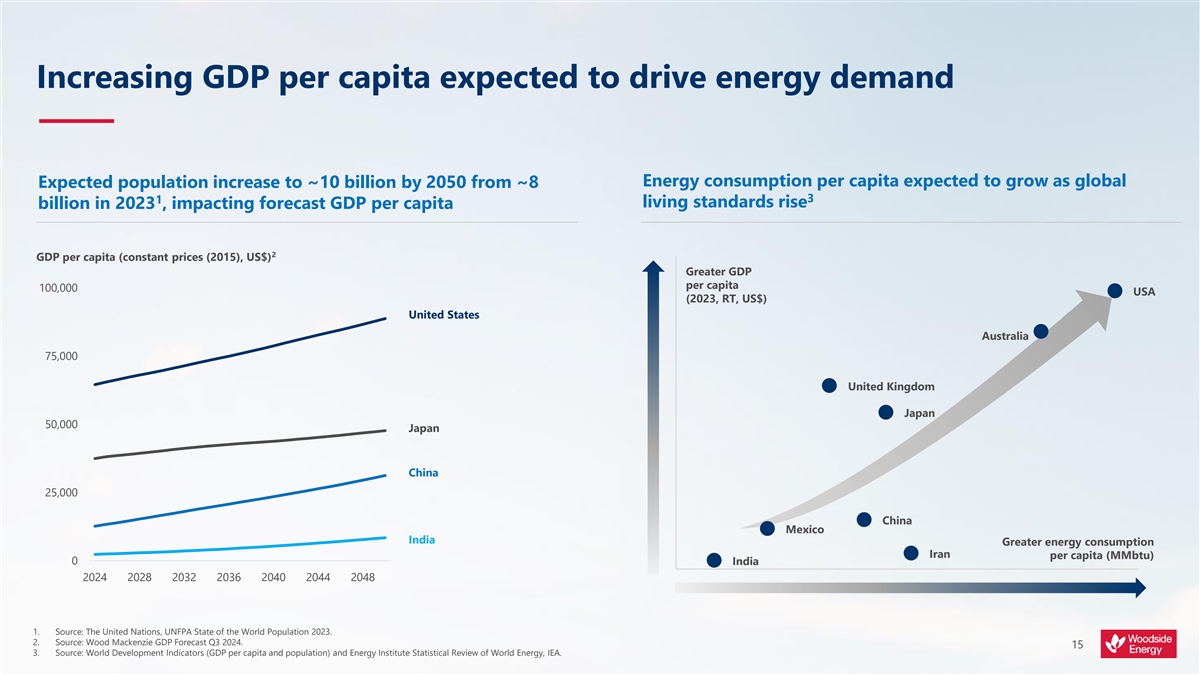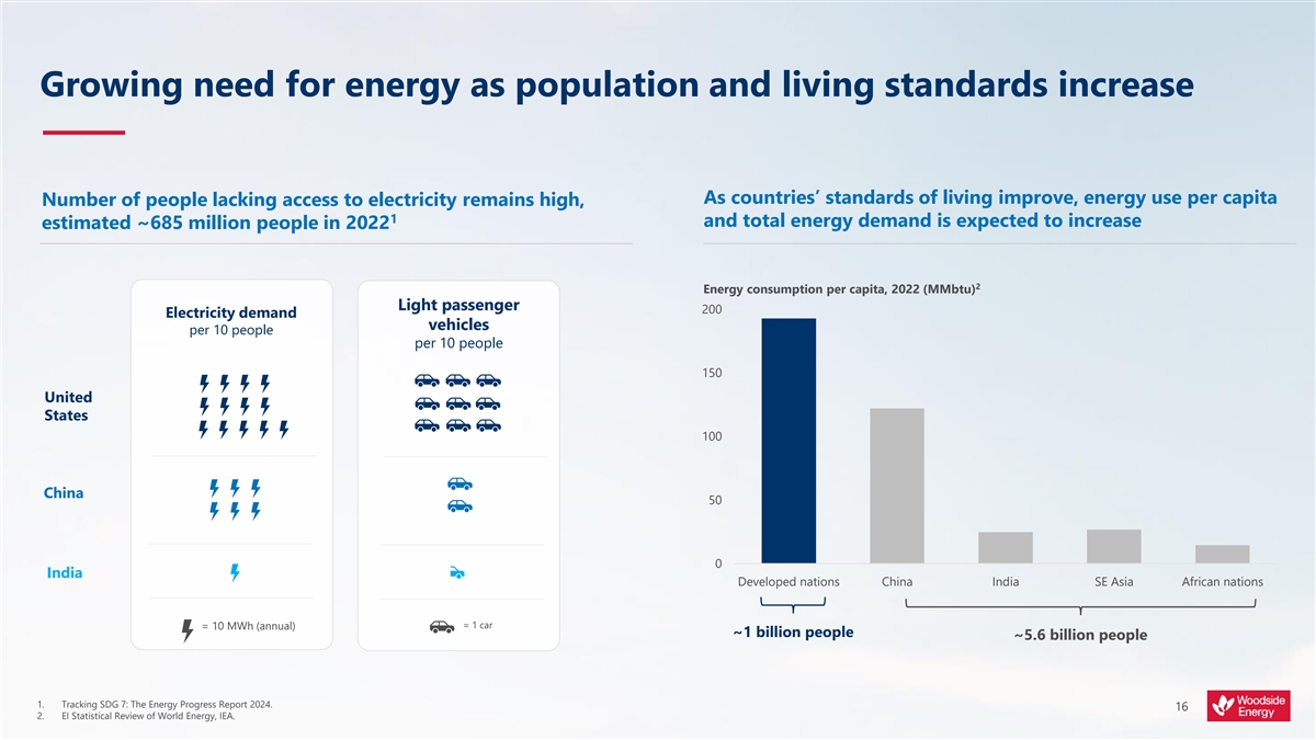 Increasing GDP per capita expected to drive energy demand Energy consumption per capita expected to grow as global Expected population increase to ~10 billion by 2050 from ~8 3 1 living standards rise billion in 2023 , impacting forecast GDP per capita 2 GDP per capita (constant prices (2015), US$) Greater GDP per capita 100,000 USA (2023, RT, US$) United States Australia 75,000 United Kingdom Japan 50,000 Japan China 25,000 China Mexico India Greater energy consumption Iran per capita (MMbtu) 0 India 2024 2028 2032 2036 2040 2044 2048 1. Source: The United Nations, UNFPA State of the World Population 2023. 2. Source: Wood Mackenzie GDP Forecast Q3 2024. 15 3. Source: World Development Indicators (GDP per capita and population) and Energy Institute Statistical Review of World Energy, IEA.