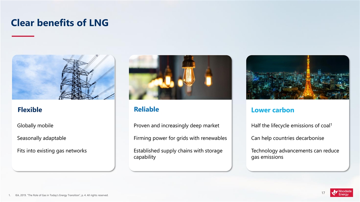 Clear benefits of LNG Reliable Flexible Lower carbon 1 Globally mobile Proven and increasingly deep market Half the lifecycle emissions of coal Seasonally adaptable Firming power for grids with renewables Can help countries decarbonise Fits into existing gas networks Established supply chains with storage Technology advancements can reduce capability gas emissions 17 1. IEA, 2019. “The Role of Gas in Today’s Energy Transition”, p. 4. All rights reserved.