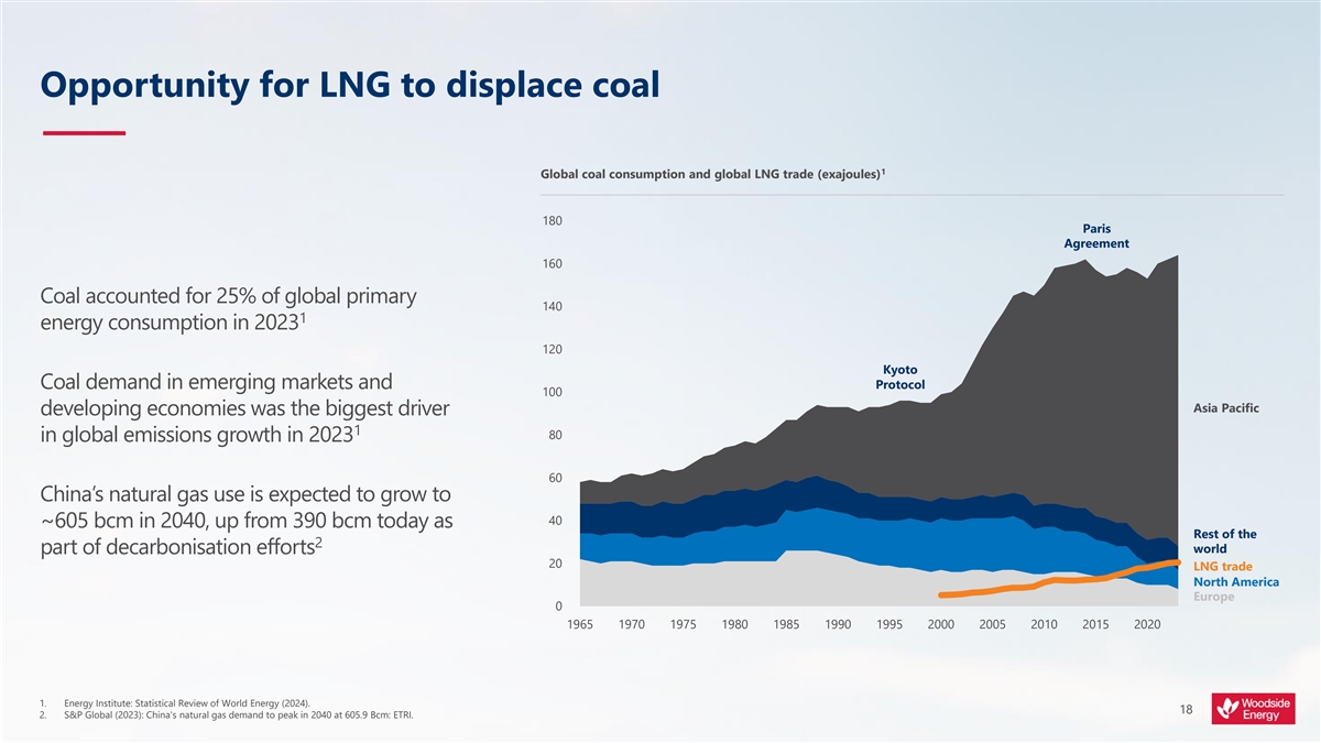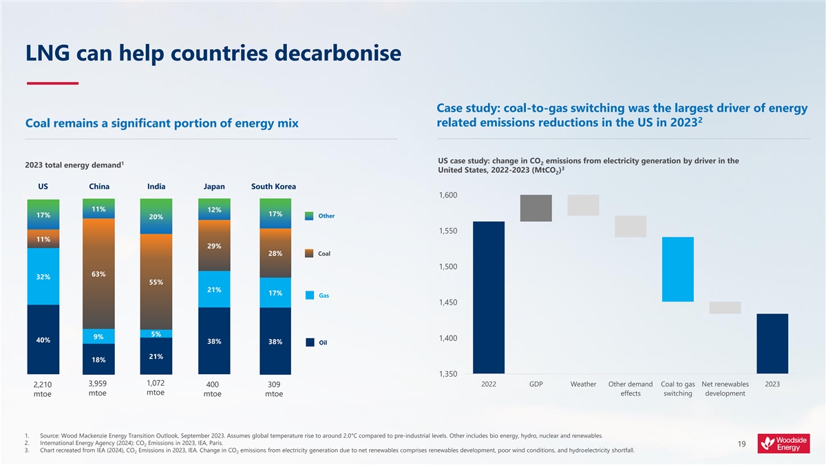 Opportunity for LNG to displace coal 1 Global coal consumption and global LNG trade (exajoules) 180 Paris Agreement 160 Coal accounted for 25% of global primary 140 1 energy consumption in 2023 120 Kyoto Coal demand in emerging markets and Protocol 100 Asia Pacific developing economies was the biggest driver 1 80 in global emissions growth in 2023 60 China’s natural gas use is expected to grow to 40 ~605 bcm in 2040, up from 390 bcm today as Rest of the 2 world part of decarbonisation efforts 20 LNG trade North America Europe 0 1965 1970 1975 1980 1985 1990 1995 2000 2005 2010 2015 2020 1. Energy Institute: Statistical Review of World Energy (2024). 18 2. S&P Global (2023): China's natural gas demand to peak in 2040 at 605.9 Bcm: ETRI.