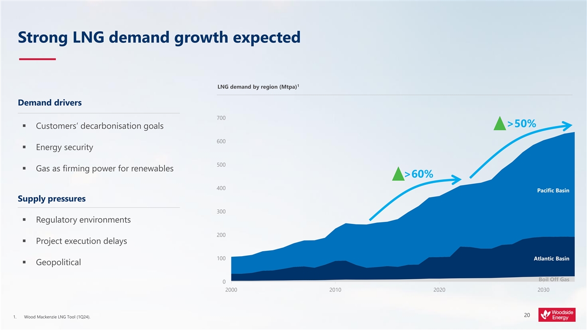 Strong LNG demand growth expected 1 LNG demand by region (Mtpa) Demand drivers 700 >50% ▪ Customers’ decarbonisation goals 600 ▪ Energy security 500 ▪ Gas as firming power for renewables >60% 400 Pacific Basin Supply pressures 300 ▪ Regulatory environments 200 ▪ Project execution delays 100 Atlantic Basin ▪ Geopolitical Boil Off Gas 0 2000 2010 2020 2030 20 1. Wood Mackenzie LNG Tool (1Q24).