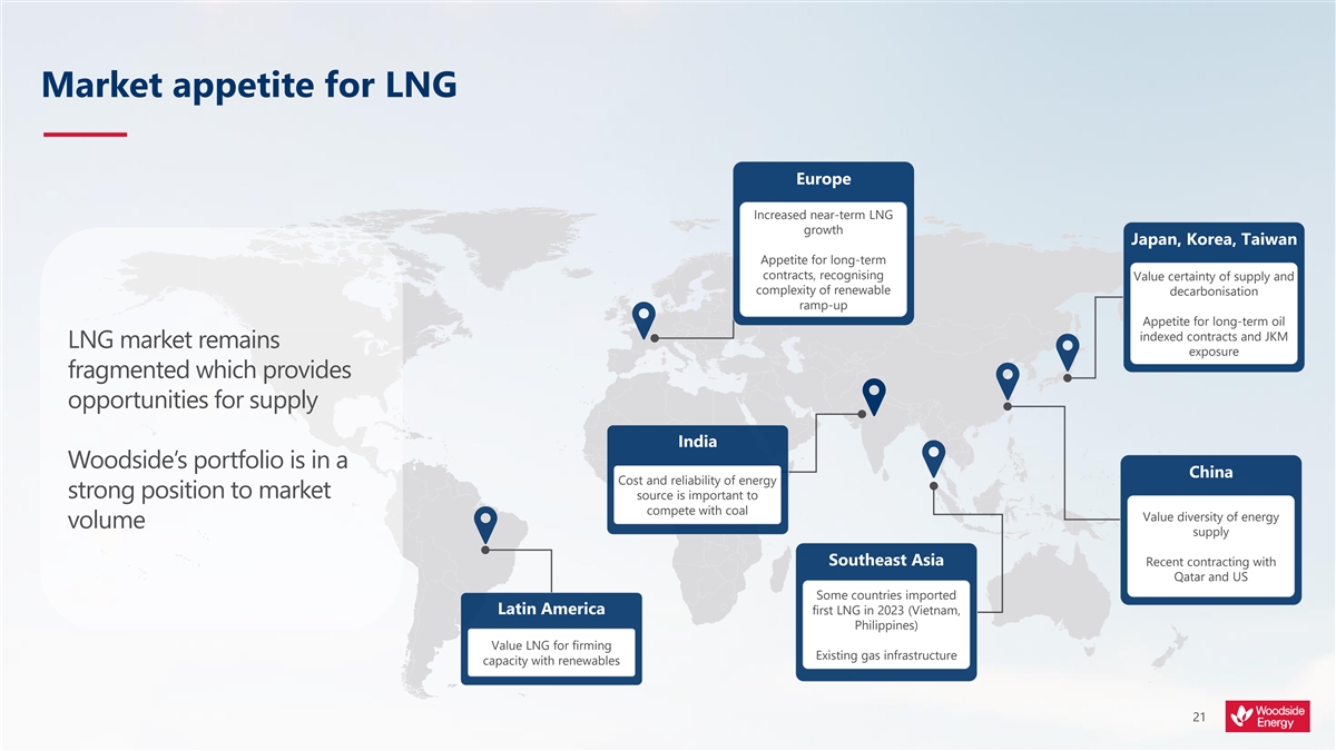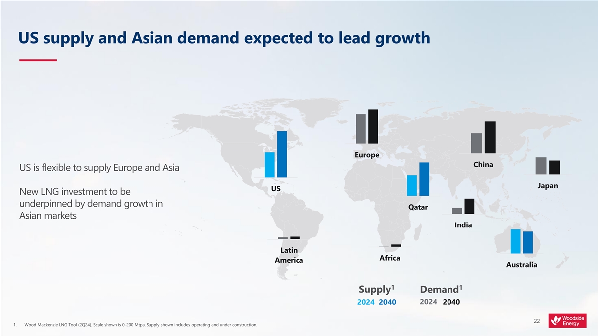 Market appetite for LNG Europe Increased near-term LNG growth Japan, Korea, Taiwan Appetite for long-term contracts, recognising Value certainty of supply and complexity of renewable decarbonisation ramp-up Appetite for long-term oil indexed contracts and JKM LNG market remains exposure fragmented which provides opportunities for supply India Woodside’s portfolio is in a China Cost and reliability of energy strong position to market source is important to compete with coal Value diversity of energy volume supply Southeast Asia Recent contracting with Qatar and US Some countries imported Latin America first LNG in 2023 (Vietnam, Philippines) Value LNG for firming Existing gas infrastructure capacity with renewables 21