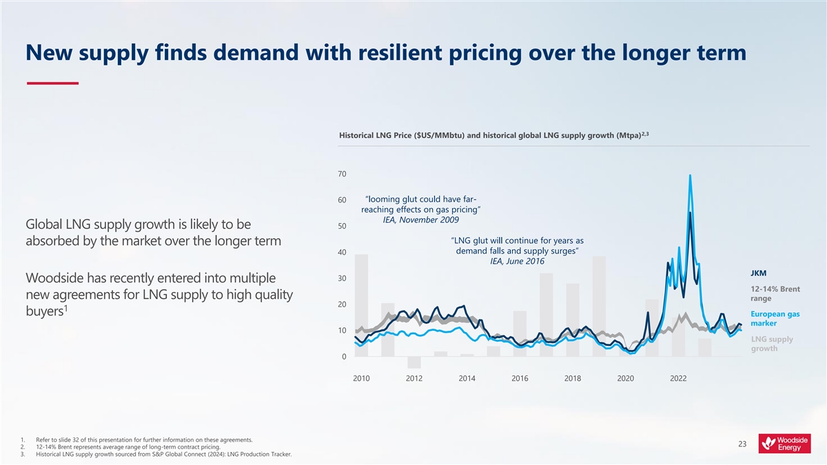 New supply finds demand with resilient pricing over the longer term 2,3 Historical LNG Price ($US/MMbtu) and historical global LNG supply growth (Mtpa) 70 60 “looming glut could have far- reaching effects on gas pricing” IEA, November 2009 Global LNG supply growth is likely to be 50 “LNG glut will continue for years as absorbed by the market over the longer term demand falls and supply surges” 40 IEA, June 2016 JKM 30 Woodside has recently entered into multiple 12-14% Brent new agreements for LNG supply to high quality range 20 1 buyers European gas marker 10 LNG supply growth 0 2010 2012 2014 2016 2018 2020 2022 -10 1. Refer to slide 32 of this presentation for further information on these agreements. 23 2. 12-14% Brent represents average range of long-term contract pricing. 3. Historical LNG supply growth sourced from S&P Global Connect (2024): LNG Production Tracker.