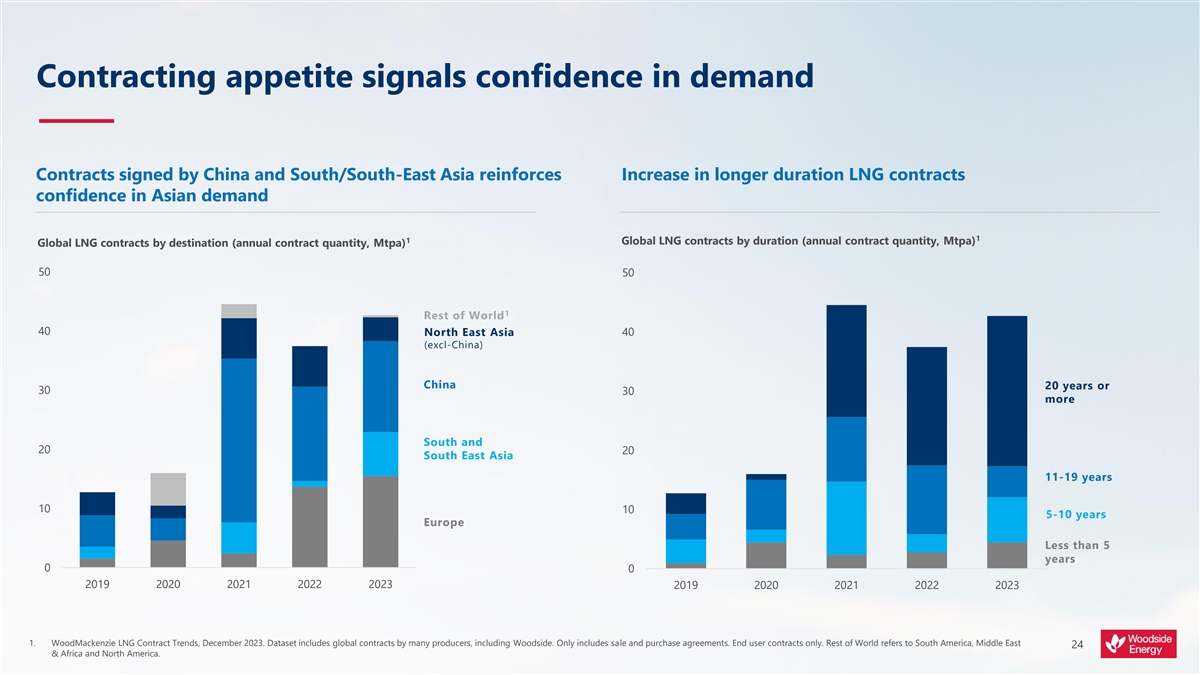 Contracting appetite signals confidence in demand Contracts signed by China and South/South-East Asia reinforces Increase in longer duration LNG contracts confidence in Asian demand 1 1 Global LNG contracts by duration (annual contract quantity, Mtpa) Global LNG contracts by destination (annual contract quantity, Mtpa) 50 50 1 Rest of World 40 North East Asia 40 (excl-China) China 20 years or 30 30 more South and 20 20 South East Asia 11-19 years 10 10 5-10 years Europe Less than 5 years 0 0 2019 2020 2021 2022 2023 2019 2020 2021 2022 2023 1. WoodMackenzie LNG Contract Trends, December 2023. Dataset includes global contracts by many producers, including Woodside. Only includes sale and purchase agreements. End user contracts only. Rest of World refers to South America, Middle East 24 & Africa and North America.