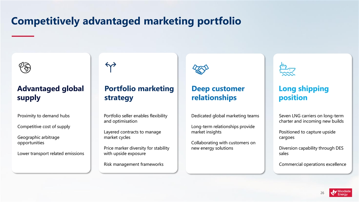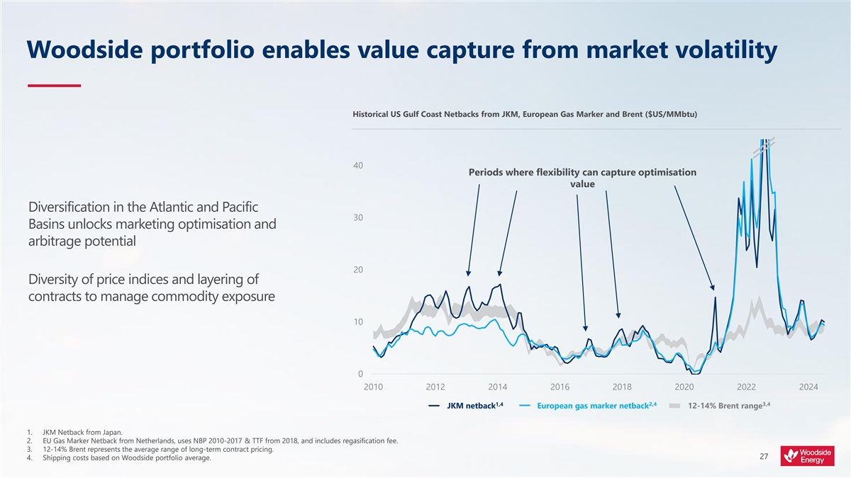 Competitively advantaged marketing portfolio Advantaged global Portfolio marketing Deep customer Long shipping supply strategy relationships position Proximity to demand hubs Portfolio seller enables flexibility Dedicated global marketing teams Seven LNG carriers on long-term and optimisation charter and incoming new builds Competitive cost of supply Long-term relationships provide Layered contracts to manage market insights Positioned to capture upside Geographic arbitrage market cycles cargoes opportunities Collaborating with customers on Price marker diversity for stability new energy solutions Diversion capability through DES Lower transport related emissions with upside exposure sales Risk management frameworks Commercial operations excellence 26