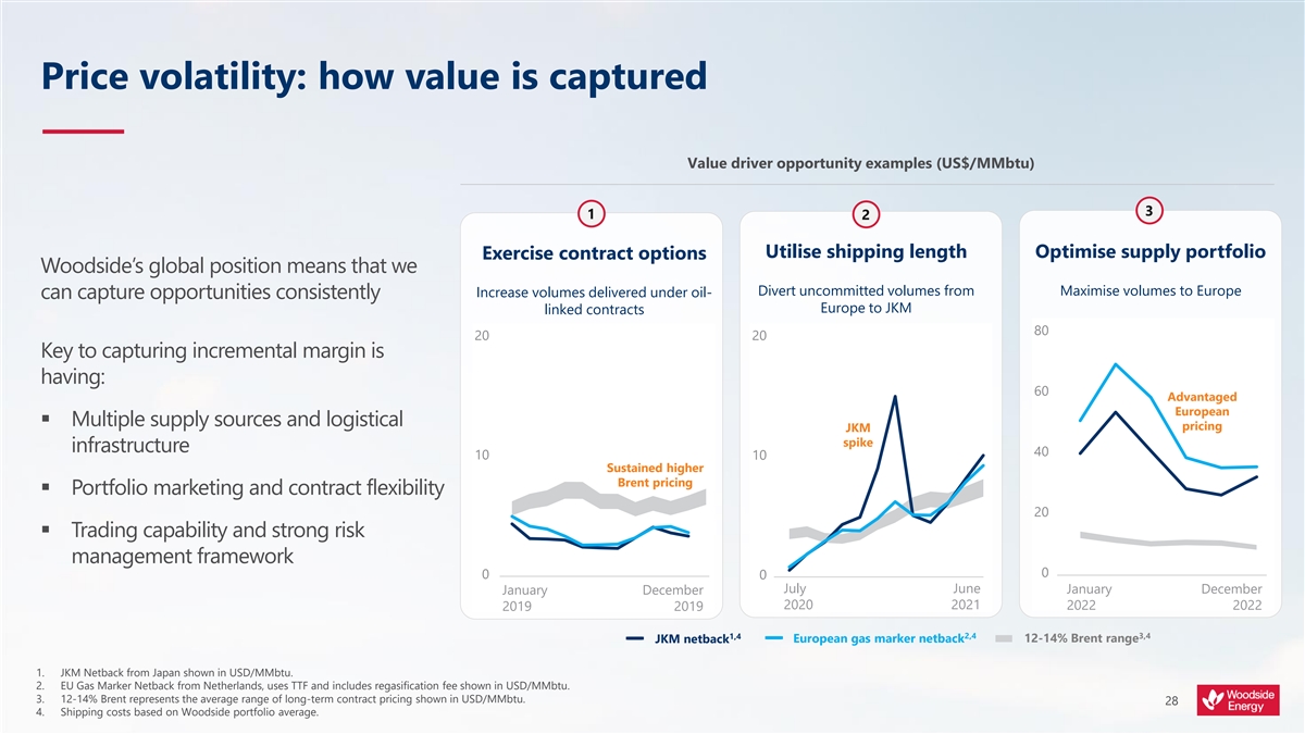 Woodside portfolio enables value capture from market volatility Historical US Gulf Coast Netbacks from JKM, European Gas Marker and Brent ($US/MMbtu) 40 Periods where flexibility can capture optimisation value Diversification in the Atlantic and Pacific 30 Basins unlocks marketing optimisation and arbitrage potential 20 Diversity of price indices and layering of contracts to manage commodity exposure 10 0 2010 2012 2014 2016 2018 2020 2022 2024 1,4 2,4 3,4 JKM netback European gas marker netback 12-14% Brent range 1. JKM Netback from Japan. 2. EU Gas Marker Netback from Netherlands, uses NBP 2010-2017 & TTF from 2018, and includes regasification fee. 3. 12-14% Brent represents the average range of long-term contract pricing. 27 4. Shipping costs based on Woodside portfolio average.