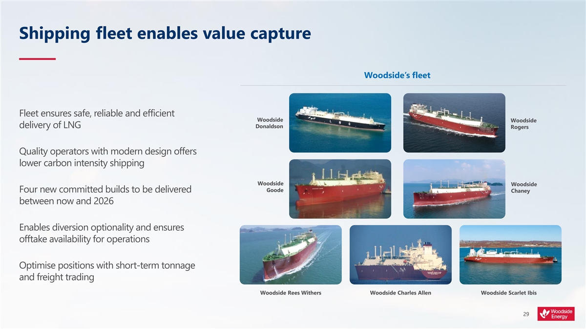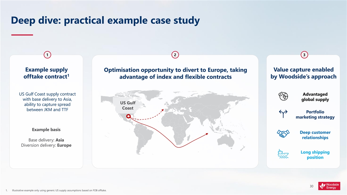 Shipping fleet enables value capture Woodside’s fleet Fleet ensures safe, reliable and efficient Woodside Woodside delivery of LNG Donaldson Rogers Quality operators with modern design offers lower carbon intensity shipping Woodside Woodside Goode Four new committed builds to be delivered Chaney between now and 2026 Enables diversion optionality and ensures offtake availability for operations Optimise positions with short-term tonnage and freight trading Woodside Rees Withers Woodside Charles Allen Woodside Scarlet Ibis 29