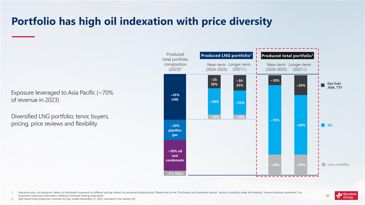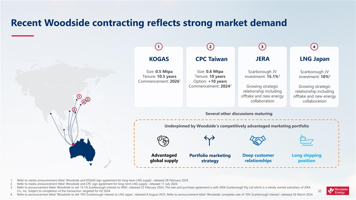 Portfolio has high oil indexation with price diversity Produced 1 1 Produced LNG portfolio Produced total portfolio total portfolio composition Longer-term Near-term Near-term Longer-term 2 (2027+) (2023) (2024-2025) (2024-2025) (2027+) ~25- ~10% ~30- Gas hub: 30% 35% ~20% JKM, TTF Exposure leveraged to Asia Pacific (~70% ~45% LNG of revenue in 2023) ~60% ~55% Diversified LNG portfolio; tenor, buyers, ~10% ~10% ~70% pricing, price reviews and flexibility ~60% Oil ~20% pipeline gas ~30% oil and condensate Low volatility ~20% ~20% ~5% NGLs 1. Indicative only, not guidance. Refers to Woodside’s exposure to different pricing indices for produced hydrocarbons. Please refer to the “Disclaimer and important notices” section (including under the heading “Forward looking statements”) for important cautionary information relating to forward looking statements. 31 2. Split based total production volumes for year ended December 31, 2023, rounded to the nearest 5%.