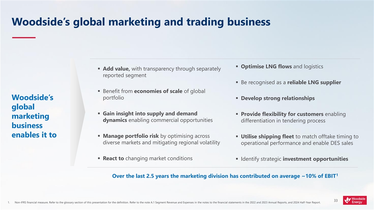 Recent Woodside contracting reflects strong market demand 1 2 3 4 JERA LNG Japan KOGAS CPC Taiwan Size: 0.5 Mtpa Size: 0.6 Mtpa Scarborough JV Scarborough JV 3 4 Tenure: 10.5 years Tenure: 10 years investment: 15.1% investment: 10% 1 Commencement: 2026 Option: +10 years 2 Commencement: 2024 Growing strategic Growing strategic relationship including relationship including offtake and new energy 1 offtake and new energy 3 collaboration collaboration 4 2 Several other discussions maturing Underpinned by Woodside’s competitively advantaged marketing portfolio Advantaged Deep customer Long shipping Portfolio marketing global supply strategy relationships position 1. Refer to media announcement titled ‘Woodside and KOGAS sign agreement for long-term LNG supply’, released 28 February 2024. 2. Refer to media announcement titled ‘Woodside and CPC sign agreement for long-term LNG supply’, released 11 July 2024. 3. Refer to announcement titled ‘Woodside to sell 15.1% Scarborough interest to JERA’, released 23 February 2024. The sale and purchase agreement is with JERA Scarborough Pty Ltd which is a wholly owned subsidiary of JERA Co., Inc. Subject to completion of the transaction, targeted for H2 2024. 32 4. Refer to announcement titled ‘Woodside to sell 10% Scarborough interest to LNG Japan’, released 8 August 2023. Refer to announcement titled ‘Woodside completes sale of 10% Scarborough interest’, released 26 March 2024.