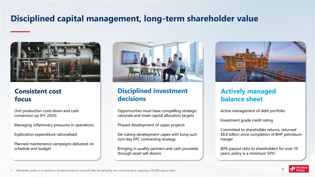 Disciplined capital management, long-term shareholder value Disciplined investment Consistent cost Actively managed decisions focus balance sheet Unit production costs down and cash Opportunities must have compelling strategic Active management of debt portfolio conversion up (H1 2024) rationale and meet capital allocation targets Investment grade credit rating Managing inflationary pressures in operations Phased development of capex projects Committed to shareholder returns, returned Exploration expenditure rationalised De-risking development capex with lump sum $8.8 billion since completion of BHP petroleum turn-key EPC contracting strategy merger Planned maintenance campaigns delivered on schedule and budget Bringing in quality partners and cash proceeds 80% payout ratio to shareholders for over 10 1 through asset sell-downs years; policy is a minimum 50% 35 1. Woodside’s policy is to maintain a dividend based on net profit after tax excluding non-recurring items, targeting a 50-80% payout ratio.