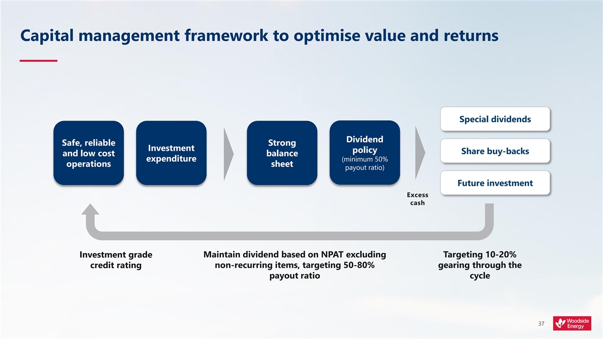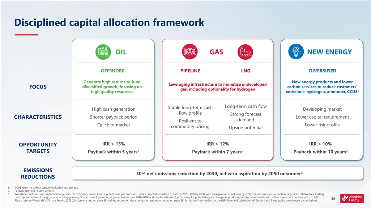 Disciplined capital allocation framework OIL GAS NEW ENERGY OFFSHORE PIPELINE LNG DIVERSIFIED Generate high returns to fund New energy products and lower Leveraging infrastructure to monetise undeveloped diversified growth, focusing on carbon services to reduce customers’ FOCUS gas, including optionality for hydrogen 1 high quality resources emissions: hydrogen, ammonia, CCUS Long-term cash flow Stable long-term cash High cash generation Developing market flow profile Strong forecast Shorter payback period Lower capital requirement CHARACTERISTICS demand Resilient to Quick to market Lower risk profile commodity pricing Upside potential IRR > 15% IRR > 12% IRR > 10% OPPORTUNITY 2 2 2 TARGETS Payback within 5 years Payback within 7 years Payback within 10 years EMISSIONS 3 30% net emissions reduction by 2030, net zero aspiration by 2050 or sooner REDUCTIONS 1. CCUS refers to carbon capture utilisation and storage. 2. Payback refers to RFSU + X years. 3. Woodside’s net emissions reduction targets are for net equity Scope 1 and 2 greenhouse gas emissions, with a targeted reduction of 15% by 2025, 30% by 2030, with an aspiration of net zero by 2050. The net emissions reduction targets are relative to a starting base representative of the gross annual average equity Scope 1 and 2 greenhouse gas emissions over 2016-2020 and may be adjusted (up or down) for potential equity changes in producing or sanctioned assets with a final investment decision prior to 2021. 36 Please refer to Woodside’s Climate Report 2022 (glossary starting on page 59 and the section on decarbonisation strategy starting on page 28) for further information on the definition and calculation of Scope 1 and 2 net equity greenhouse gas emissions.