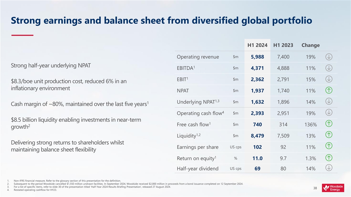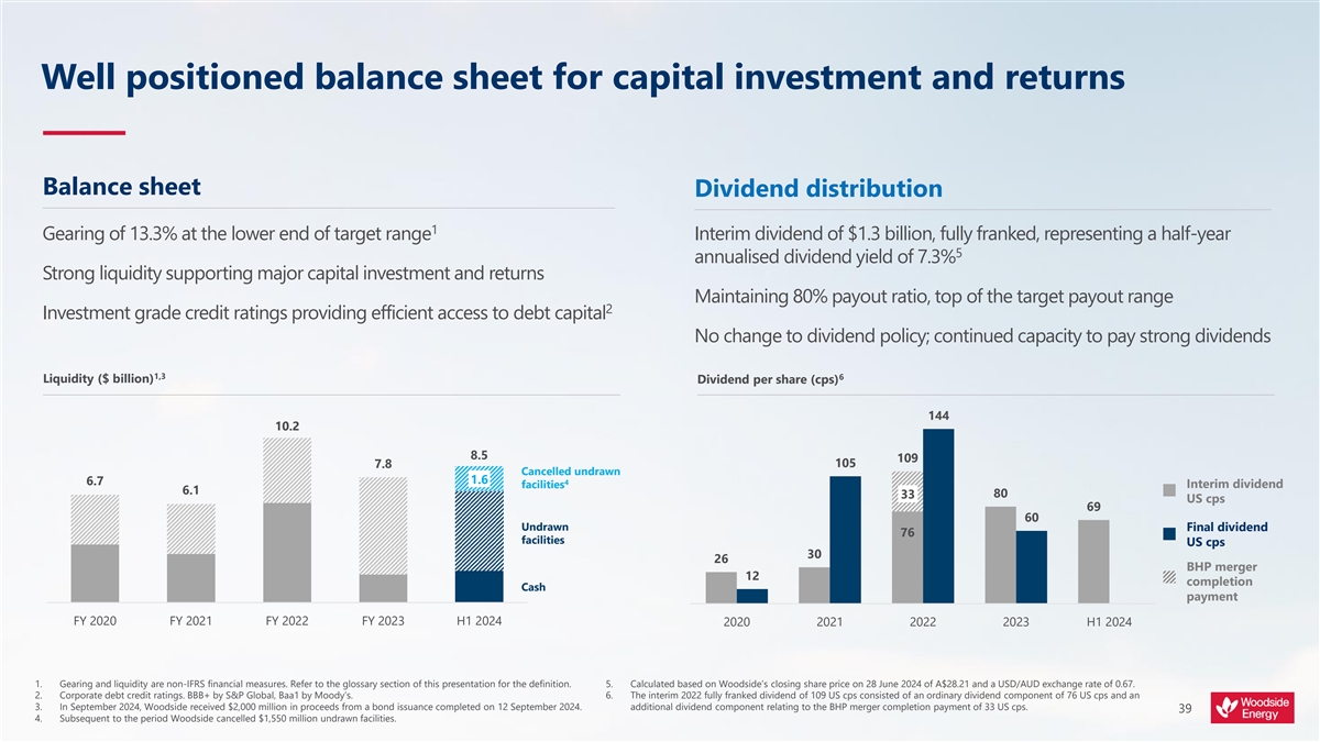 Strong earnings and balance sheet from diversified global portfolio H1 2024 H1 2023 Change $m Operating revenue 5,988 7,400 19% Strong half-year underlying NPAT 1 $m EBITDA 4,371 4,888 11% 1 $m EBIT 2,362 2,791 15% $8.3/boe unit production cost, reduced 6% in an inflationary environment $m NPAT 1,937 1,740 11% 1,3 $m Underlying NPAT 1,632 1,896 14% 1 Cash margin of ~80%, maintained over the last five years 4 $m Operating cash flow 2,393 2,951 19% $8.5 billion liquidity enabling investments in near-term 1 $m Free cash flow 740 314 136% 2 growth 1,2 $m Liquidity 8,479 7,509 13% Delivering strong returns to shareholders whilst US cps Earnings per share 102 92 11% maintaining balance sheet flexibility 1 % Return on equity 11.0 9.7 1.3% US cps Half-year dividend 69 80 14% 1. Non-IFRS financial measure. Refer to the glossary section of this presentation for the definition. 2. Subsequent to the period Woodside cancelled $1,550 million undrawn facilities. In September 2024, Woodside received $2,000 million in proceeds from a bond issuance completed on 12 September 2024. 3. For a list of specific items, refer to slide 30 of the presentation titled ‘Half-Year 2024 Results Briefing Presentation’, released 27 August 2024. 38 4. Restated operating cashflow for HY23.