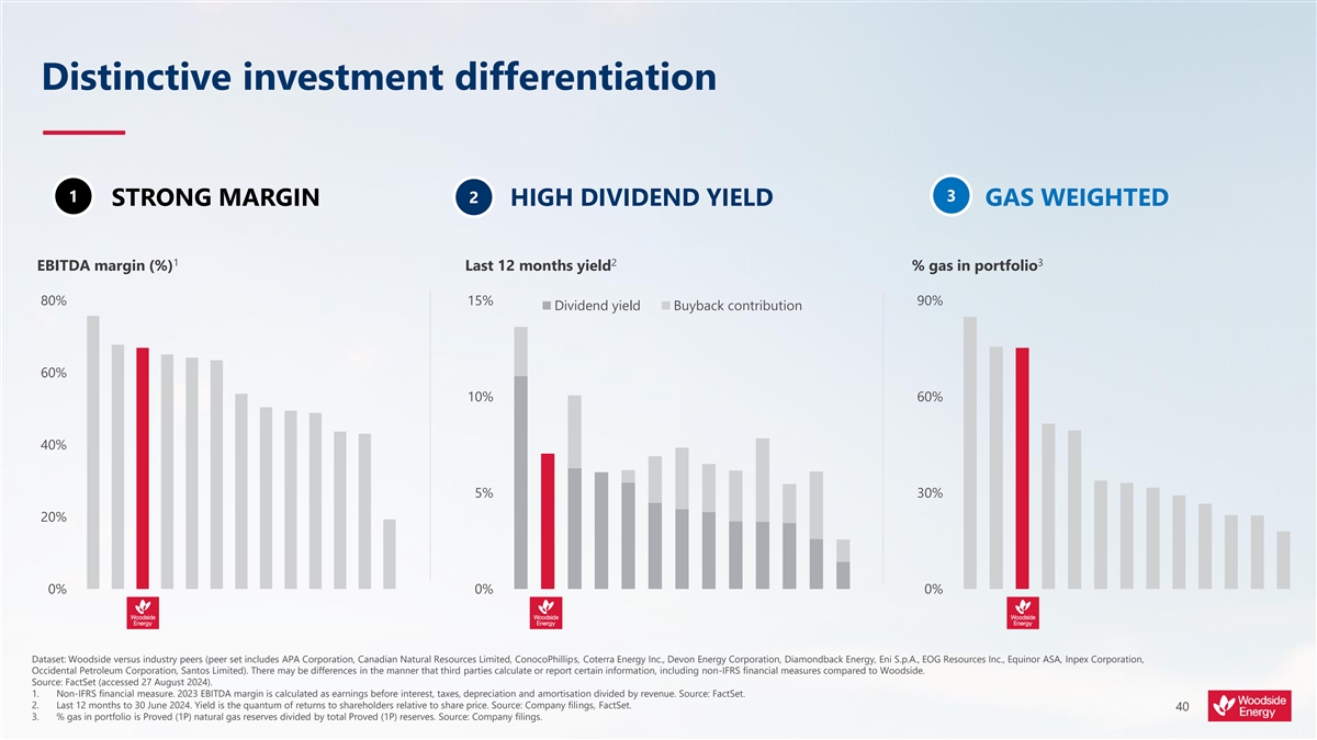 Distinctive investment differentiation 3 1 2 STRONG MARGIN HIGH DIVIDEND YIELD GAS WEIGHTED 1 2 3 EBITDA margin (%) Last 12 months yield % gas in portfolio 80% 15% 90% Dividend yield Buyback contribution 60% 10% 60% 40% 5% 30% 20% 0% 0% 0% Dataset: Woodside versus industry peers (peer set includes APA Corporation, Canadian Natural Resources Limited, ConocoPhillips, Coterra Energy Inc., Devon Energy Corporation, Diamondback Energy, Eni S.p.A., EOG Resources Inc., Equinor ASA, Inpex Corporation, Occidental Petroleum Corporation, Santos Limited). There may be differences in the manner that third parties calculate or report certain information, including non-IFRS financial measures compared to Woodside. Source: FactSet (accessed 27 August 2024). 1. Non-IFRS financial measure. 2023 EBITDA margin is calculated as earnings before interest, taxes, depreciation and amortisation divided by revenue. Source: FactSet. 2. Last 12 months to 30 June 2024. Yield is the quantum of returns to shareholders relative to share price. Source: Company filings, FactSet. 40 3. % gas in portfolio is Proved (1P) natural gas reserves divided by total Proved (1P) reserves. Source: Company filings.