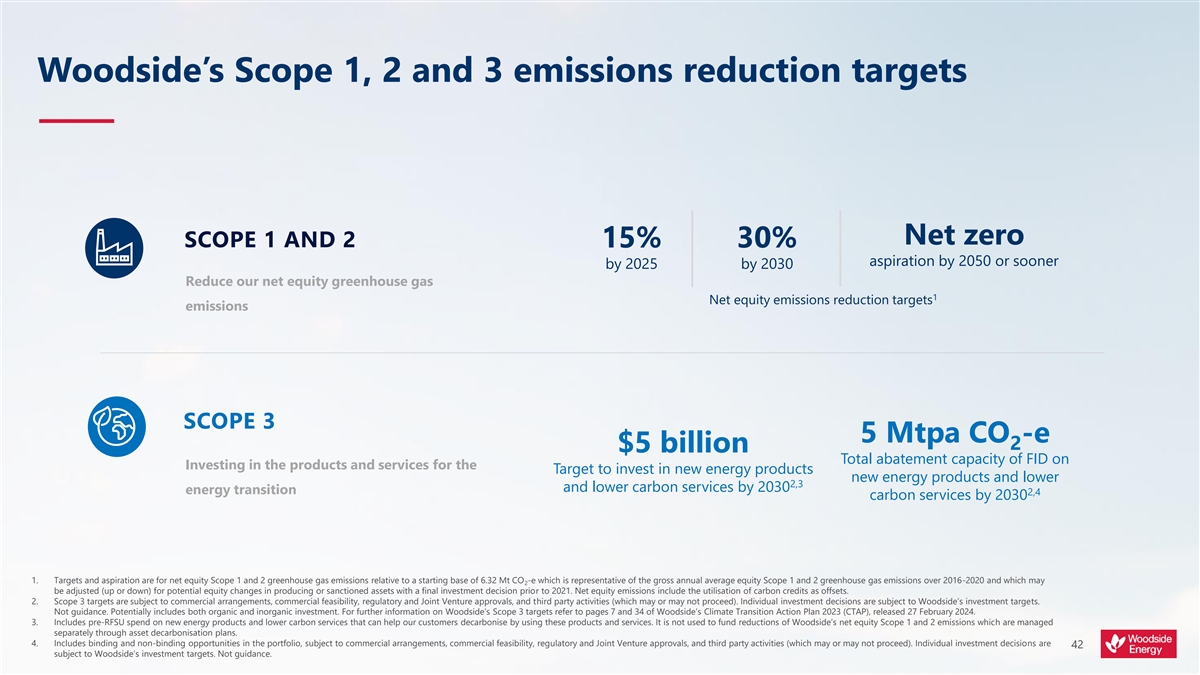 Woodside’s Scope 1, 2 and 3 emissions reduction targets Net zero SCOPE 1 AND 2 15% 30% aspiration by 2050 or sooner by 2025 by 2030 Reduce our net equity greenhouse gas 1 Net equity emissions reduction targets emissions SCOPE 3 5 Mtpa CO -e 2 $5 billion Total abatement capacity of FID on Investing in the products and services for the Target to invest in new energy products new energy products and lower 2,3 and lower carbon services by 2030 energy transition 2,4 carbon services by 2030 1. Targets and aspiration are for net equity Scope 1 and 2 greenhouse gas emissions relative to a starting base of 6.32 Mt CO -e which is representative of the gross annual average equity Scope 1 and 2 greenhouse gas emissions over 2016-2020 and which may 2 be adjusted (up or down) for potential equity changes in producing or sanctioned assets with a final investment decision prior to 2021. Net equity emissions include the utilisation of carbon credits as offsets. 2. Scope 3 targets are subject to commercial arrangements, commercial feasibility, regulatory and Joint Venture approvals, and third party activities (which may or may not proceed). Individual investment decisions are subject to Woodside’s investment targets. Not guidance. Potentially includes both organic and inorganic investment. For further information on Woodside’s Scope 3 targets refer to pages 7 and 34 of Woodside’s Climate Transition Action Plan 2023 (CTAP), released 27 February 2024. 3. Includes pre-RFSU spend on new energy products and lower carbon services that can help our customers decarbonise by using these products and services. It is not used to fund reductions of Woodside’s net equity Scope 1 and 2 emissions which are managed separately through asset decarbonisation plans. 4. Includes binding and non-binding opportunities in the portfolio, subject to commercial arrangements, commercial feasibility, regulatory and Joint Venture approvals, and third party activities (which may or may not proceed). Individual investment decisions are 42 subject to Woodside’s investment targets. Not guidance.