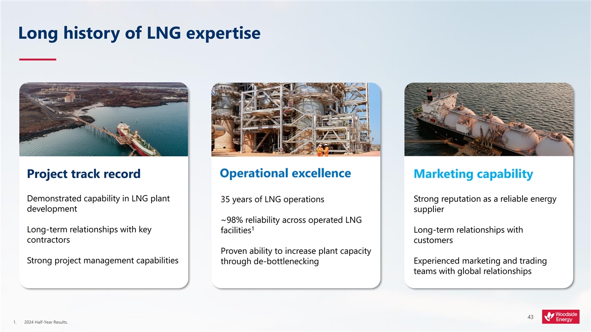 Long history of LNG expertise Operational excellence Project track record Marketing capability Demonstrated capability in LNG plant Strong reputation as a reliable energy 35 years of LNG operations development supplier ~98% reliability across operated LNG 1 Long-term relationships with key facilities Long-term relationships with contractors customers Proven ability to increase plant capacity Strong project management capabilities Experienced marketing and trading through de-bottlenecking teams with global relationships 43 1. 2024 Half-Year Results.