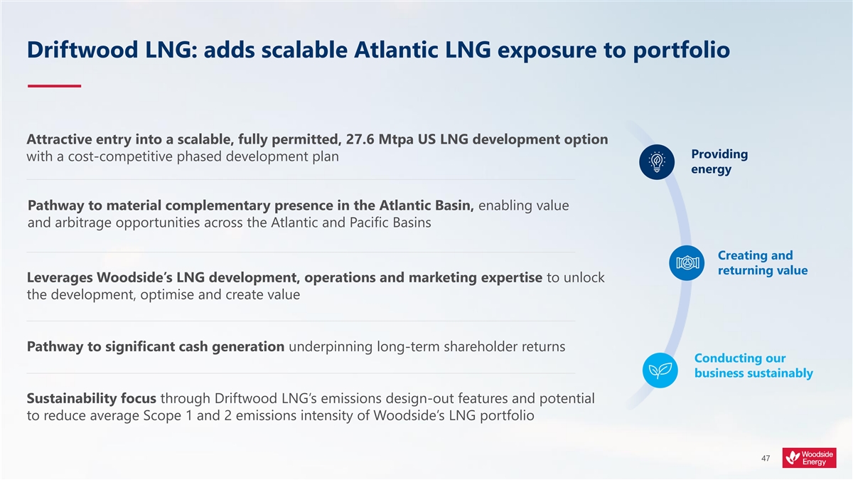 Driftwood LNG: adds scalable Atlantic LNG exposure to portfolio Attractive entry into a scalable, fully permitted, 27.6 Mtpa US LNG development option Providing with a cost-competitive phased development plan energy Pathway to material complementary presence in the Atlantic Basin, enabling value and arbitrage opportunities across the Atlantic and Pacific Basins Creating and returning value Leverages Woodside’s LNG development, operations and marketing expertise to unlock the development, optimise and create value Pathway to significant cash generation underpinning long-term shareholder returns Conducting our business sustainably Sustainability focus through Driftwood LNG’s emissions design-out features and potential to reduce average Scope 1 and 2 emissions intensity of Woodside’s LNG portfolio 47