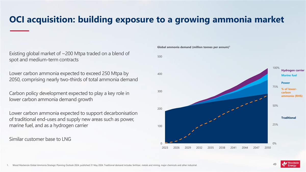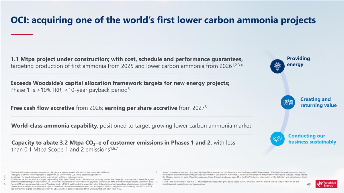 OCI: acquiring one of the world’s first lower carbon ammonia projects Providing 1.1 Mtpa project under construction; with cost, schedule and performance guarantees, 1,2,3,4 energy targeting production of first ammonia from 2025 and lower carbon ammonia from 2026 Exceeds Woodside’s capital allocation framework targets for new energy projects; 5 Phase 1 is >10% IRR, <10-year payback period Creating and returning value 5 Free cash flow accretive from 2026; earning per share accretive from 2027 World-class ammonia capability; positioned to target growing lower carbon ammonia market Conducting our business sustainably Capacity to abate 3.2 Mtpa CO –e of customer emissions in Phases 1 and 2, with less 2 1,6,7 than 0.1 Mtpa Scope 1 and 2 emissions 1. Woodside will market ammonia volumes into the global ammonia market, which in 2023 represented ~200 Mtpa. 6. Scope 3 emissions abatement capacity of 1.6 Mtpa CO -e assumes supply of carbon abated hydrogen and CCS operational. Woodside has made the assumption to 2 2. The supply of carbon abated hydrogen is dependent on ExxonMobil’s CCS facility becoming operational. estimate the avoided emissions through the displacement of conventional marine fuel. Actual displaced emissions may differ based on actual use case. Please refer to 3. See glossary for key definitions including lower carbon and lower carbon ammonia. the Glossary starting on page 22 and the section on Scope 3 targets starting on page 34 of the CTAP for further information on the definition and calculation of Scope 4. With limited exceptions, such as changes requested by Woodside, OCI will expend the resources necessary to complete the project ensuring that it meets the agreed 3 targets. performance standards prior to hand over. OCI will also be responsible for limited financial payments to Woodside if the project is delayed beyond September 2025. 7. Scope 1 and 2 emissions of less than 0.1 Mtpa represent Woodside's gross equity Scope 1 and 2 emissions from the project and are comprised of the on-site 5. Forecast IRR and payback period assume Woodside equity of 100% and include the acquisition price. IRR and the payback period are a look forward from July 2024. electricity requirements for ammonia production. 48 Lower carbon ammonia price assumes an uplift to Woodside’s internal unabated ammonia cost assumption. In 2025 the uplift is $0/t increasing to ~$120/t in 2034 (real terms 2024) aligned with the phase in of the CBAM. Payback period is calculated from undiscounted cash flows from RFSU.