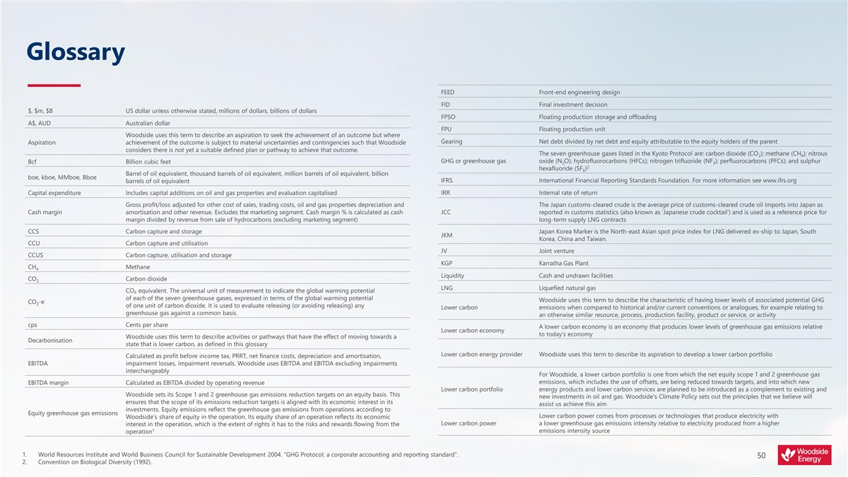 Glossary FEED Front-end engineering design FID Final investment decision $, $m, $B US dollar unless otherwise stated, millions of dollars, billions of dollars FPSO Floating production storage and offloading A$, AUD Australian dollar FPU Floating production unit Woodside uses this term to describe an aspiration to seek the achievement of an outcome but where Gearing Net debt divided by net debt and equity attributable to the equity holders of the parent Aspiration achievement of the outcome is subject to material uncertainties and contingencies such that Woodside considers there is not yet a suitable defined plan or pathway to achieve that outcome. The seven greenhouse gases listed in the Kyoto Protocol are: carbon dioxide (CO ); methane (CH ); nitrous 2 4 GHG or greenhouse gas oxide (N O); hydrofluorocarbons (HFCs); nitrogen trifluoride (NF ); perfluorocarbons (PFCs); and sulphur Bcf Billion cubic feet 2 3 2 hexafluoride (SF ) 6 Barrel of oil equivalent, thousand barrels of oil equivalent, million barrels of oil equivalent, billion boe, kboe, MMboe, Bboe barrels of oil equivalent IFRS International Financial Reporting Standards Foundation. For more information see www.ifrs.org Capital expenditure Includes capital additions on oil and gas properties and evaluation capitalised IRR Internal rate of return Gross profit/loss adjusted for other cost of sales, trading costs, oil and gas properties depreciation and The Japan customs-cleared crude is the average price of customs-cleared crude oil imports into Japan as Cash margin amortisation and other revenue. Excludes the marketing segment. Cash margin % is calculated as cash JCC reported in customs statistics (also known as ‘Japanese crude cocktail’) and is used as a reference price for margin divided by revenue from sale of hydrocarbons (excluding marketing segment) long-term supply LNG contracts CCS Carbon capture and storage Japan Korea Marker is the North-east Asian spot price index for LNG delivered ex-ship to Japan, South JKM Korea, China and Taiwan. CCU Carbon capture and utilisation JV Joint venture CCUS Carbon capture, utilisation and storage KGP Karratha Gas Plant CH Methane 4 Liquidity Cash and undrawn facilities CO Carbon dioxide 2 LNG Liquefied natural gas CO₂ equivalent. The universal unit of measurement to indicate the global warming potential of each of the seven greenhouse gases, expressed in terms of the global warming potential Woodside uses this term to describe the characteristic of having lower levels of associated potential GHG CO -e 2 of one unit of carbon dioxide. It is used to evaluate releasing (or avoiding releasing) any Lower carbon emissions when compared to historical and/or current conventions or analogues, for example relating to greenhouse gas against a common basis. an otherwise similar resource, process, production facility, product or service, or activity cps Cents per share A lower carbon economy is an economy that produces lower levels of greenhouse gas emissions relative Lower carbon economy to today’s economy Woodside uses this term to describe activities or pathways that have the effect of moving towards a Decarbonisation state that is lower carbon, as defined in this glossary Lower carbon energy provider Woodside uses this term to describe its aspiration to develop a lower carbon portfolio Calculated as profit before income tax, PRRT, net finance costs, depreciation and amortisation, EBITDA impairment losses, impairment reversals. Woodside uses EBITDA and EBITDA excluding impairments interchangeably For Woodside, a lower carbon portfolio is one from which the net equity scope 1 and 2 greenhouse gas emissions, which includes the use of offsets, are being reduced towards targets, and into which new EBITDA margin Calculated as EBITDA divided by operating revenue Lower carbon portfolio energy products and lower carbon services are planned to be introduced as a complement to existing and Woodside sets its Scope 1 and 2 greenhouse gas emissions reduction targets on an equity basis. This new investments in oil and gas. Woodside’s Climate Policy sets out the principles that we believe will ensures that the scope of its emissions reduction targets is aligned with its economic interest in its assist us achieve this aim investments. Equity emissions reflect the greenhouse gas emissions from operations according to Equity greenhouse gas emissions Lower carbon power comes from processes or technologies that produce electricity with Woodside’s share of equity in the operation. Its equity share of an operation reflects its economic Lower carbon power a lower greenhouse gas emissions intensity relative to electricity produced from a higher interest in the operation, which is the extent of rights it has to the risks and rewards flowing from the 1 emissions intensity source operation 1. World Resources Institute and World Business Council for Sustainable Development 2004. “GHG Protocol: a corporate accounting and reporting standard”. 50 2. Convention on Biological Diversity (1992).