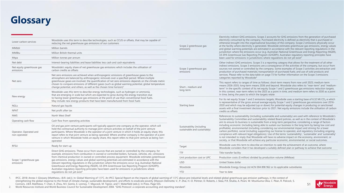 Glossary Electricity indirect GHG emissions. Scope 2 accounts for GHG emissions from the generation of purchased electricity consumed by the company. Purchased electricity is defined as electricity that is purchased or Woodside uses this term to describe technologies, such as CCUS or offsets, that may be capable of Lower carbon services otherwise brought into the organisational boundary of the company. Scope 2 emissions physically occur reducing the net greenhouse gas emissions of our customers Scope 2 greenhouse gas at the facility where electricity is generated. Woodside estimates greenhouse gas emissions, energy values MMbbl Million barrels emissions and global warming potentials are estimated in accordance with the relevant reporting regulations in the jurisdiction where the emissions occur (e.g. Australian National Greenhouse and Energy Reporting (NGER), MMBtu Million British thermal units US EPA Greenhouse Gas Reporting Program (GHGRP)). Australian regulatory reporting principles have 2 Mtpa Million tonnes per annum been used for emissions in jurisdictions where regulations do not yet exist Net debt Interest-bearing liabilities and lease liabilities less cash and cash equivalents Other indirect GHG emissions. Scope 3 is a reporting category that allows for the treatment of all other indirect emissions. Scope 3 emissions are a consequence of the activities of the company, but occur from Net equity greenhouse gas Woodside’s equity share of net greenhouse gas emissions which includes the utilisation of Scope 3 greenhouse gas sources not owned or controlled by the company. Some examples of Scope 3 activities are extraction and emissions carbon credits as offsets emissions production of purchased materials; transportation of purchased fuels; and use of sold products and services. Please refer to the data table on page 73 for further information on the Scope 3 emissions Net zero emissions are achieved when anthropogenic emissions of greenhouse gases to the 2 categories reported by Woodside atmosphere are balanced by anthropogenic removals over a specified period. Where multiple Net zero greenhouse gases are involved, the quantification of net zero emissions depends on the climate metric This report refers to ranges of time as follows: short-term means from now until 2025; medium-term chosen to compare emissions of different gases (such as global warming potential, global temperature means 2026-2035; long-term means 2036 and beyond. Woodside also refers to “near-term” and “medium- 1 change potential, and others, as well as the chosen time horizon) Short-, medium and term” in the specific context of its net equity Scope 1 and 2 greenhouse gas emissions reduction targets. long-term In this context, near-term refers to the 2025 as a point in time, and medium term refers to 2030 as a point Woodside uses this term to describe energy technologies, such as hydrogen or ammonia, in time, being the years to which the targets relate that are emerging in scale but which are expected to grow during the energy transition due New energy to having lower greenhouse gas emissions at the point of use than conventional fossil fuels. For its net equity Scope 1 and 2 emissions targets, Woodside uses a starting base of 6.32 Mt CO -e which 2 May include new energy products that have been manufactured from fossil fuels is representative of the gross annual average equity Scope 1 and 2 greenhouse gas emissions over 2016- Starting base 2020 and which may be adjusted (up or down) for potential equity changes in producing or sanctioned NGLs Natural gas liquids assets with a final investment decision prior to 2021. Net equity emissions include the utilisation of carbon NPAT Net profit after tax credits as offsets NWS North West Shelf References to sustainability (including sustainable and sustainably) are used with reference to Woodside’s Sustainability Committee and sustainability related Board policies, as well as in the context of Woodside’s Operating cash flow Cash flow from operating activities aim to ensure its business is sustainable from a long-term perspective, considering a range of factors including economic (including being able to sustain our business in the long term by being low cost and Oil and gas joint venture participants will typically appoint one company as the operator, which will Sustainability (including profitable), environmental (including considering our environmental impact and striving for a lower hold the contractual authority to manage joint venture activities on behalf of the joint venture sustainable and sustainably) carbon portfolio), social (including supporting our license to operate), and regulatory (including ongoing Operator, Operated and participants. Where Woodside is the operator of a joint venture in which it holds an equity share, this compliance with relevant legal obligations). Use of the terms ‘sustainability’, ‘sustainable’ and ‘sustainably’ non-operated report refers to that joint venture as being operated. Where another company is the operator of a joint is not intended to imply that Woodside will have no adverse impact on the economy, environment, or venture in which Woodside holds an equity share, this report refers to that joint venture as being non- society, or that Woodside will achieve any particular economic, environmental, or social outcomes. operated Woodside uses this term to describe an intention to seek the achievement of an outcome, where RFSU Ready for start-up Target Woodside considers that it has developed a suitably defined plan or pathway to achieve that outcome Direct GHG emissions. These occur from sources that are owned or controlled by the company, for TTF Title transfer facility example, emissions from combustion in owned or controlled boilers, furnaces, vehicles, etc.; emissions from chemical production in owned or controlled process equipment. Woodside estimates greenhouse Unit production cost or UPC Production costs (